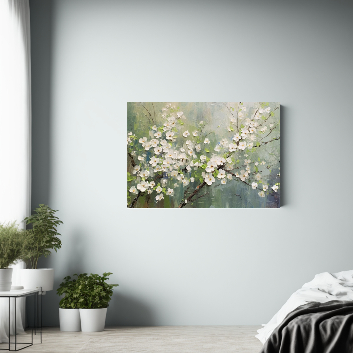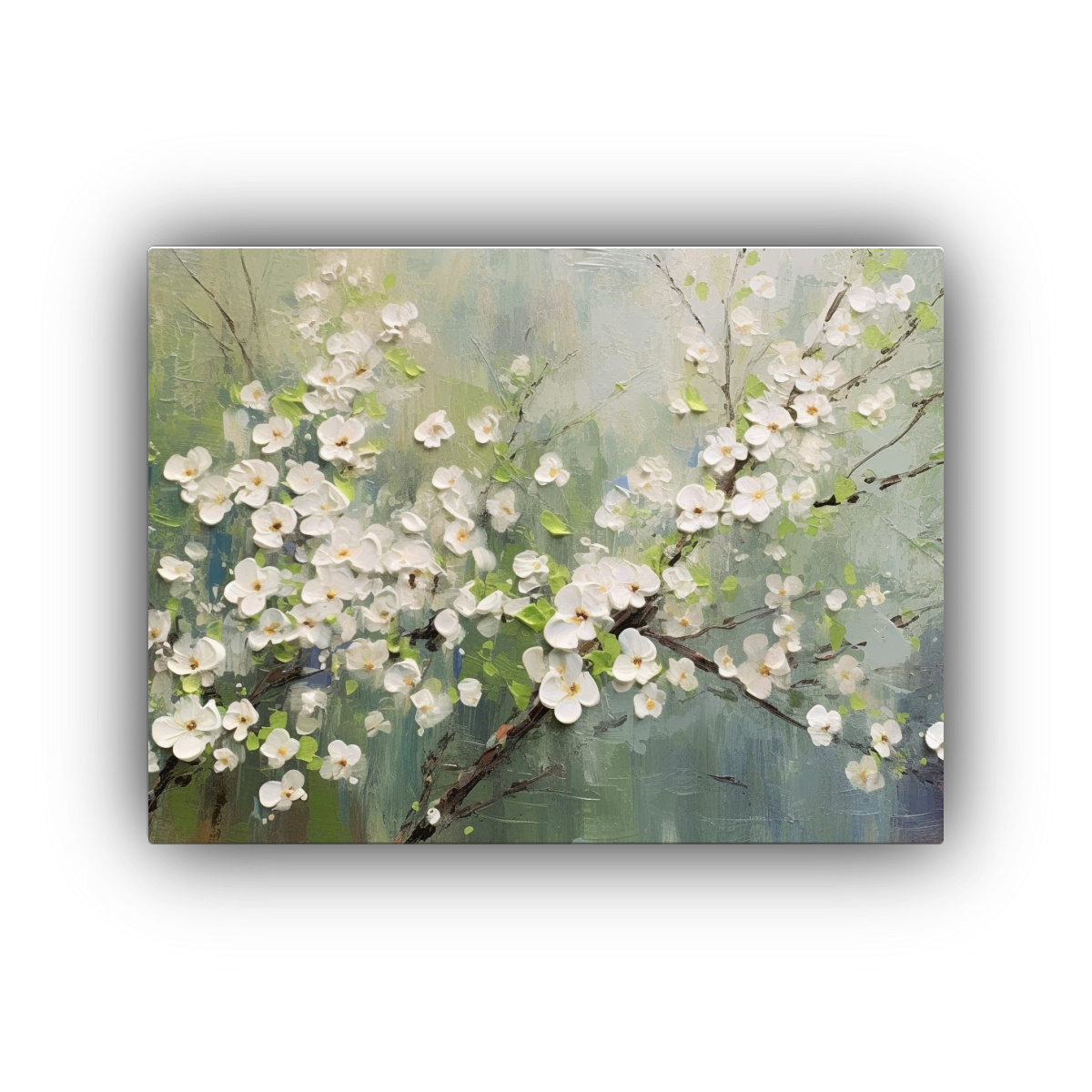 Para lograr un ambiente armonioso, coloca este Cuadro con Patrón de Flores Blancas en Estilo Estilo Óleo en una pared de tonos suaves como beige o gris claro Combínalo con muebles en tonos plateados para un look sofisticado y moderno