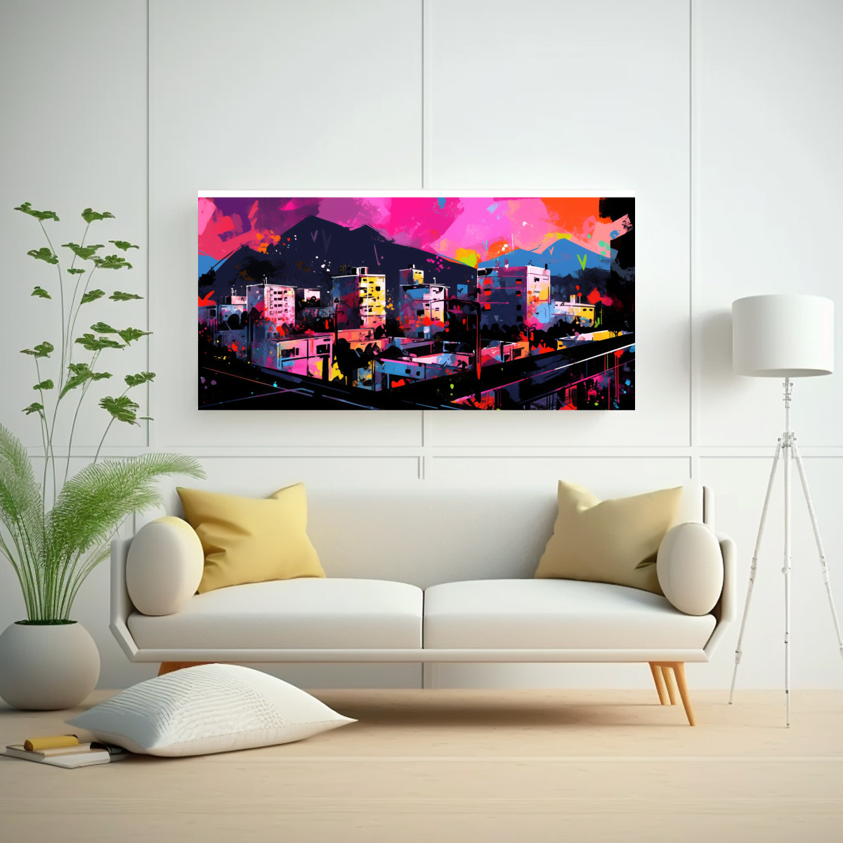Coloca este cuadro en la sala de estar para darle un toque moderno y colorido a tu espacio Combínalo con muebles en tonos neutros para resaltar su vibrante paleta de colores ¡Transforma tu ambiente con esta pieza única de arte urbano!