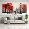 Este cuadro mural de personas caminando bajo la lluvia con paraguas rojo y árboles es ideal para decorar tu sala de estar o tu dormitorio Combínalo con muebles en tonos grisáceos o beige para crear un ambiente acogedor y elegante ¡Dale un toque artístico a tus espacios con este diseño exclusivo de DecoCuadros!