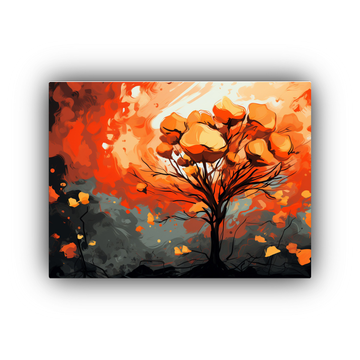 Este cuadro de Árbol Kauri en Colores Naranja es perfecto para dar un toque moderno a tu sala de estar Colócalo sobre un mueble blanco para resaltar sus colores vibrantes y crear un contraste elegante Combínalo con cojines en tonos neutros y una lámpara de pie para una decoración sofisticada y actual