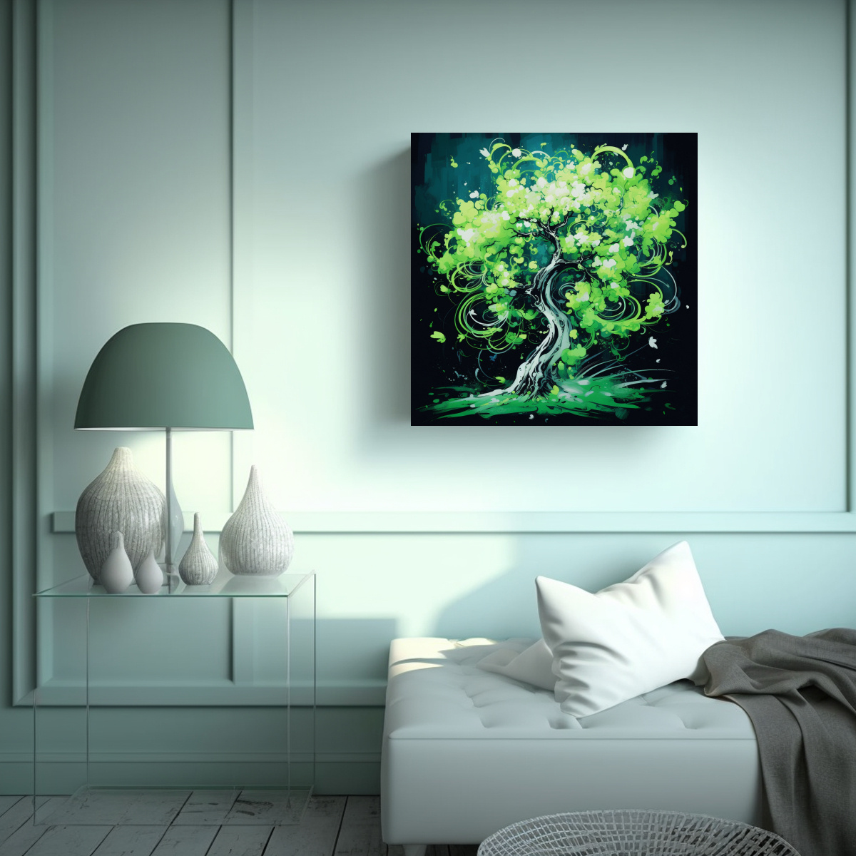 Cuadro De Arte Contemporáneo: Árbol De Manzana En Colores Verdes, Ambiente Neonoir Y Neo Pop