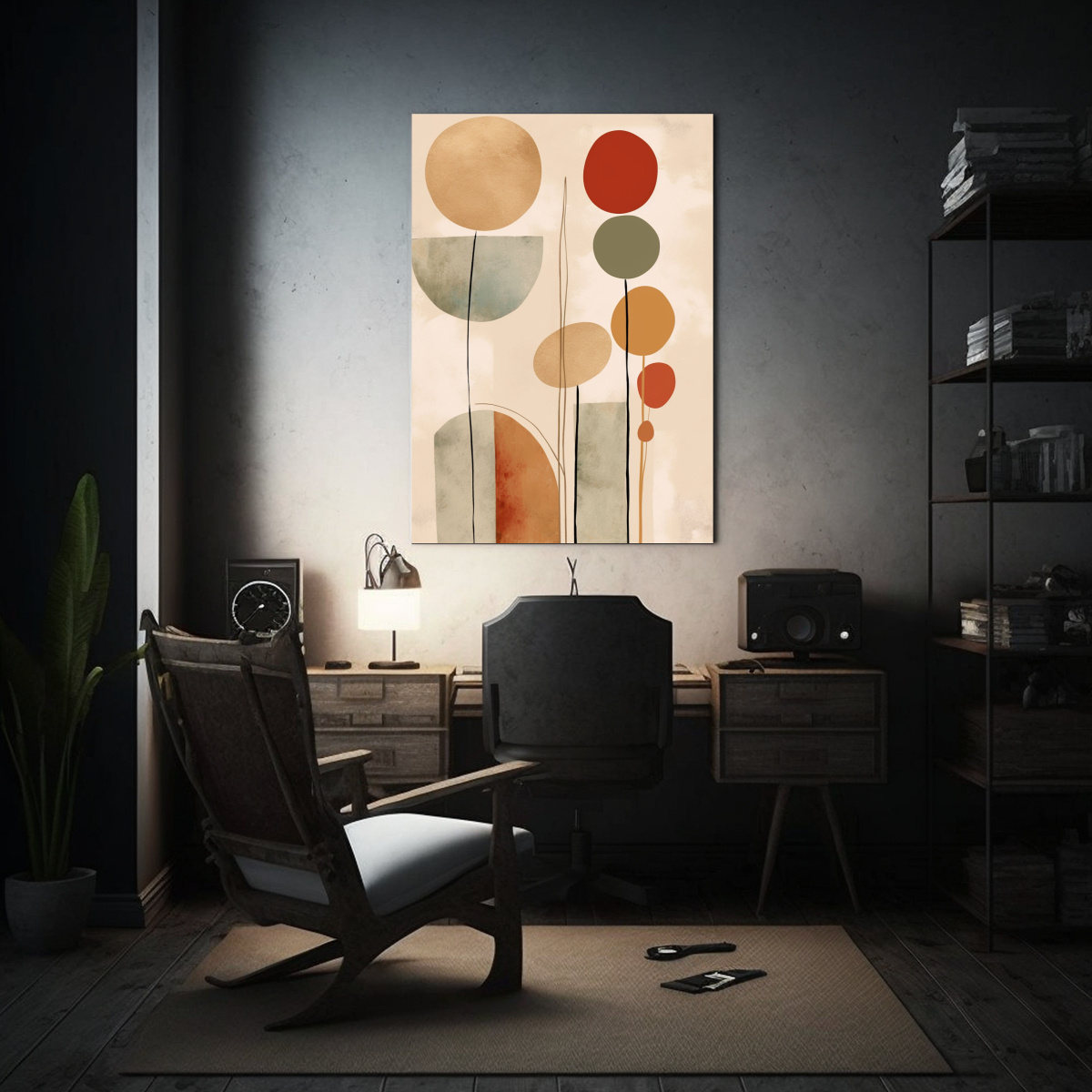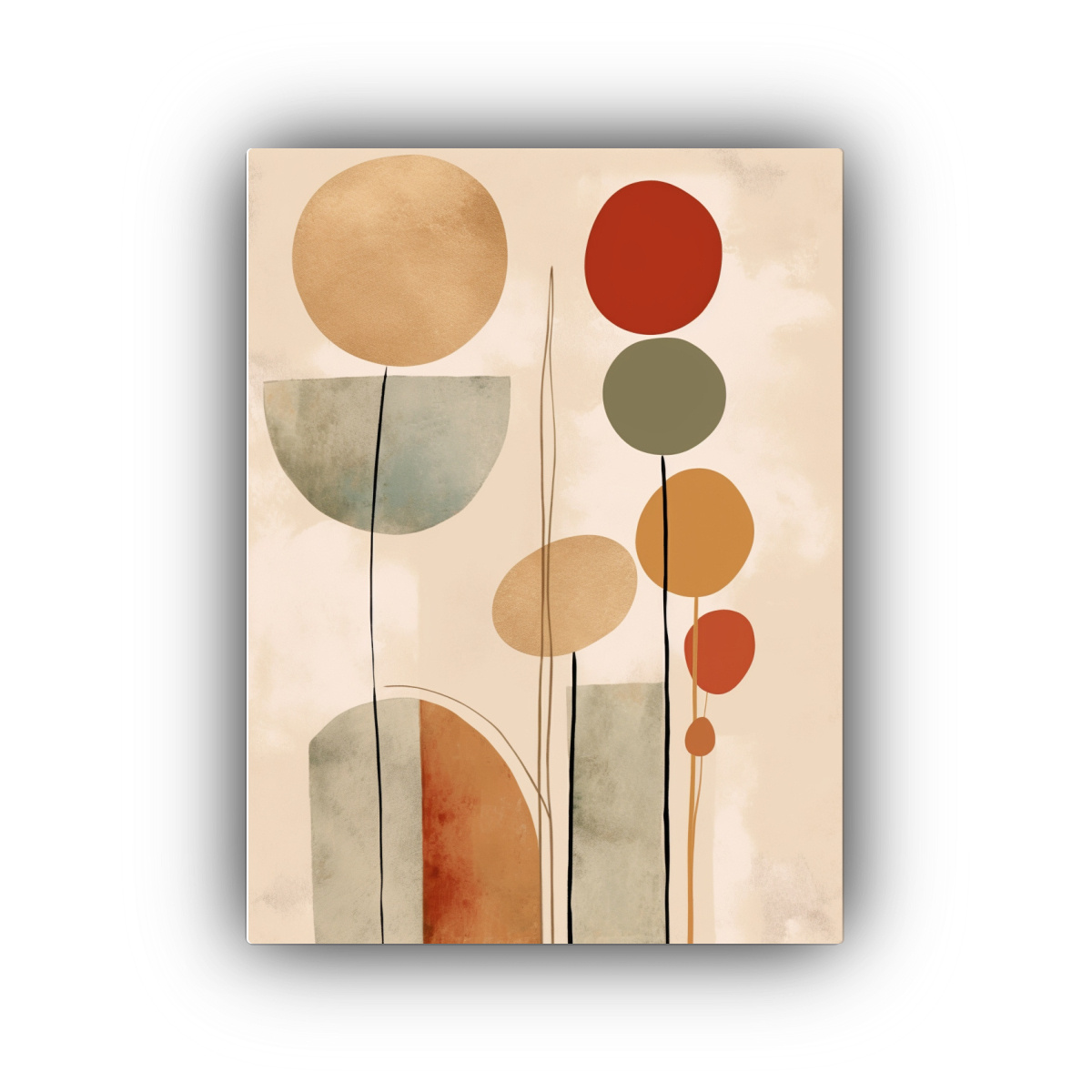 Este cuadro de arte moderno boho con formas minimalistas sería perfecto para decorar tu sala de estar Combínalo con muebles en tonos neutros como beige y gris, y agrega cojines en tonos carmesí y coral para darle un toque de color Colócalo sobre un sofá negro para crear un contraste elegante ¡Atrévete a darle un toque sofisticado a tu hogar con este hermoso cuadro!