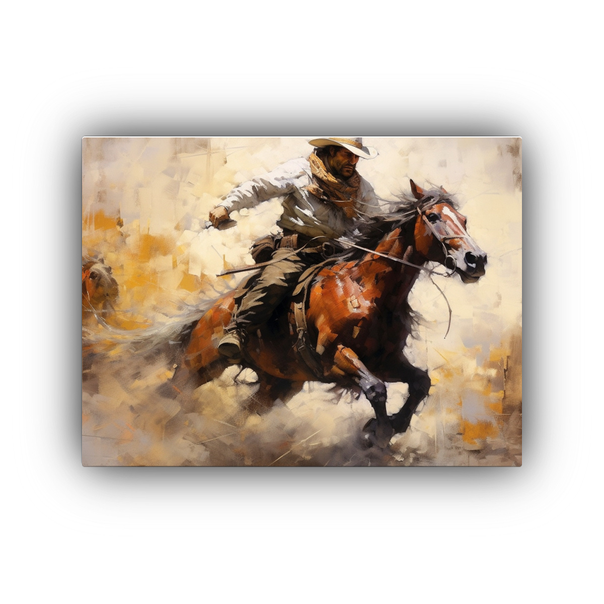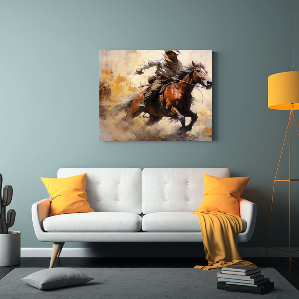 Coloca este cuadro de cowboy domando caballo en la sala de estar para crear un ambiente rústico y lleno de energía Combínalo con muebles de madera y detalles en tonos tierra para resaltar su impacto visual ¡Dale vida a tus paredes con estilo y personalidad!