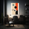 Este cuadro clásico retro estilo gráfico minimalista de Bauhaus en colores Coral, Negro, Beige, Gris y Plateado es ideal para decorar una sala de estar moderna Puede ser colocado sobre un mueble en tonos neutros, como un sofá beige, para crear un contraste y resaltar su diseño Además, se puede combinar con cojines y cortinas en tonos grises o plateados para lograr una armonía visual en la decoración