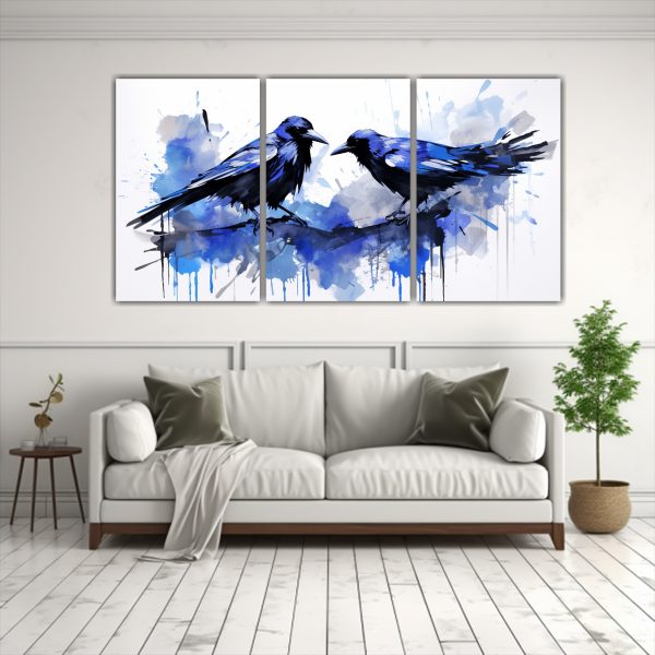 Coloca este cuadro de cuervos y cuervos en tonos azules en tu sala de estar sobre un sofá gris para lograr un contraste moderno y sofisticado Combínalo con cojines en tonos plateados y blancos para una decoración elegante y actual ¡Crea un ambiente único y cautivador en tu hogar!