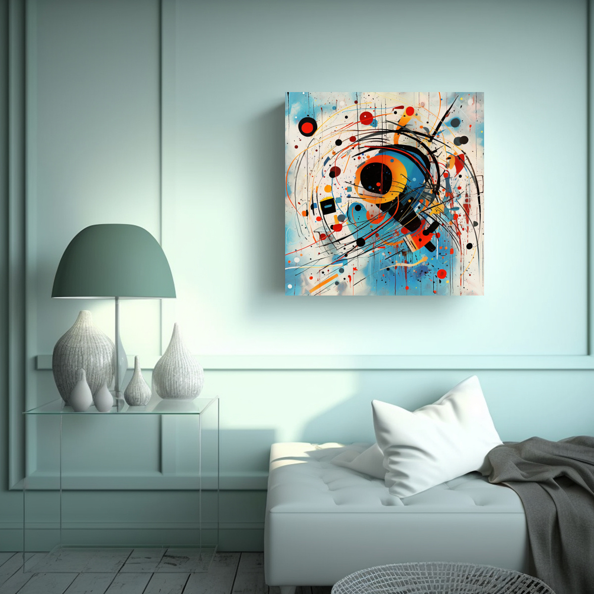 Este cuadro sería perfecto para decorar tu sala de estar o dormitorio Puedes colgarlo sobre un sofá o una cama para crear un punto focal impresionante Combina los colores del cuadro con cojines y cortinas en tonos similares para lograr una armonía visual ¡Atrévete a darle un toque artístico y moderno a tu hogar con este cuadro de belleza única!
