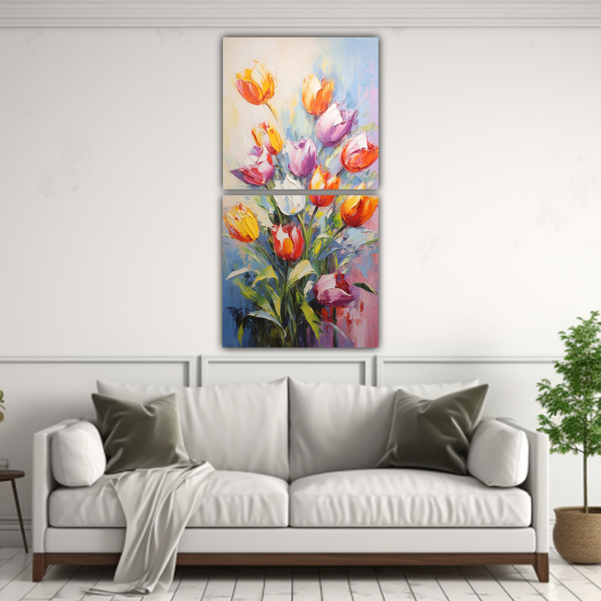 Coloca este cuadro en tu sala de estar o en tu dormitorio para darle un toque vibrante y elegante a tu espacio Combínalo con muebles en tonos neutros como blanco, gris o beige para resaltar aún más los colores de los tulipanes ¡Sorprende a tus invitados con esta hermosa pieza de arte!