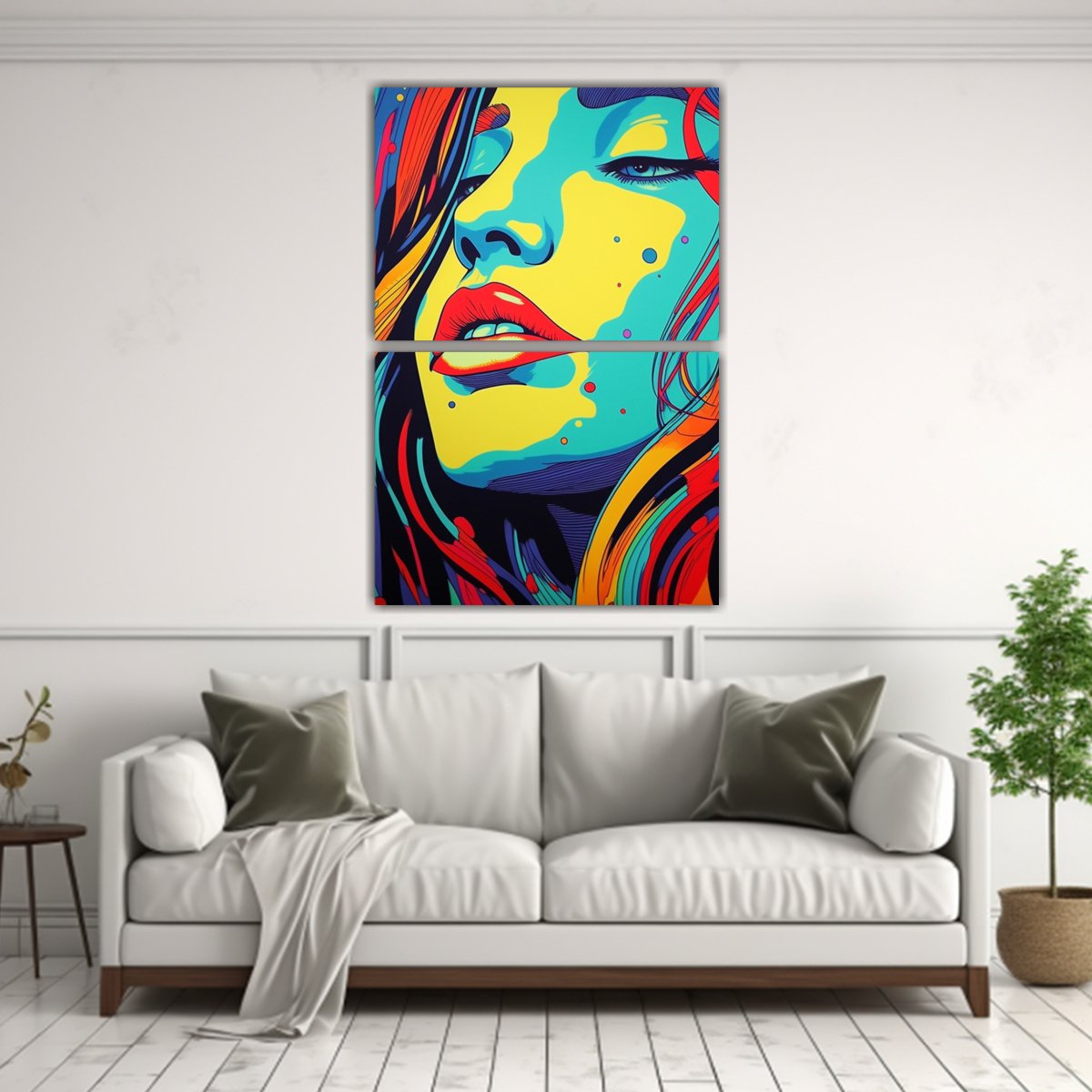 Este cuadro de diseño con efecto visual y mujer colorida es perfecto para decorar salas de estar, dormitorios o incluso espacios de trabajo Te recomendamos colocarlo en una pared de color neutro para resaltar los tonos dorado, turquesa, carmesí y negro del cuadro Combínalo con muebles de estilo moderno o minimalista para crear un ambiente elegante y sofisticado ¡Deja que este cuadro sea el centro de atención en tu espacio y disfruta de su diseño exclusivo y llamativo!