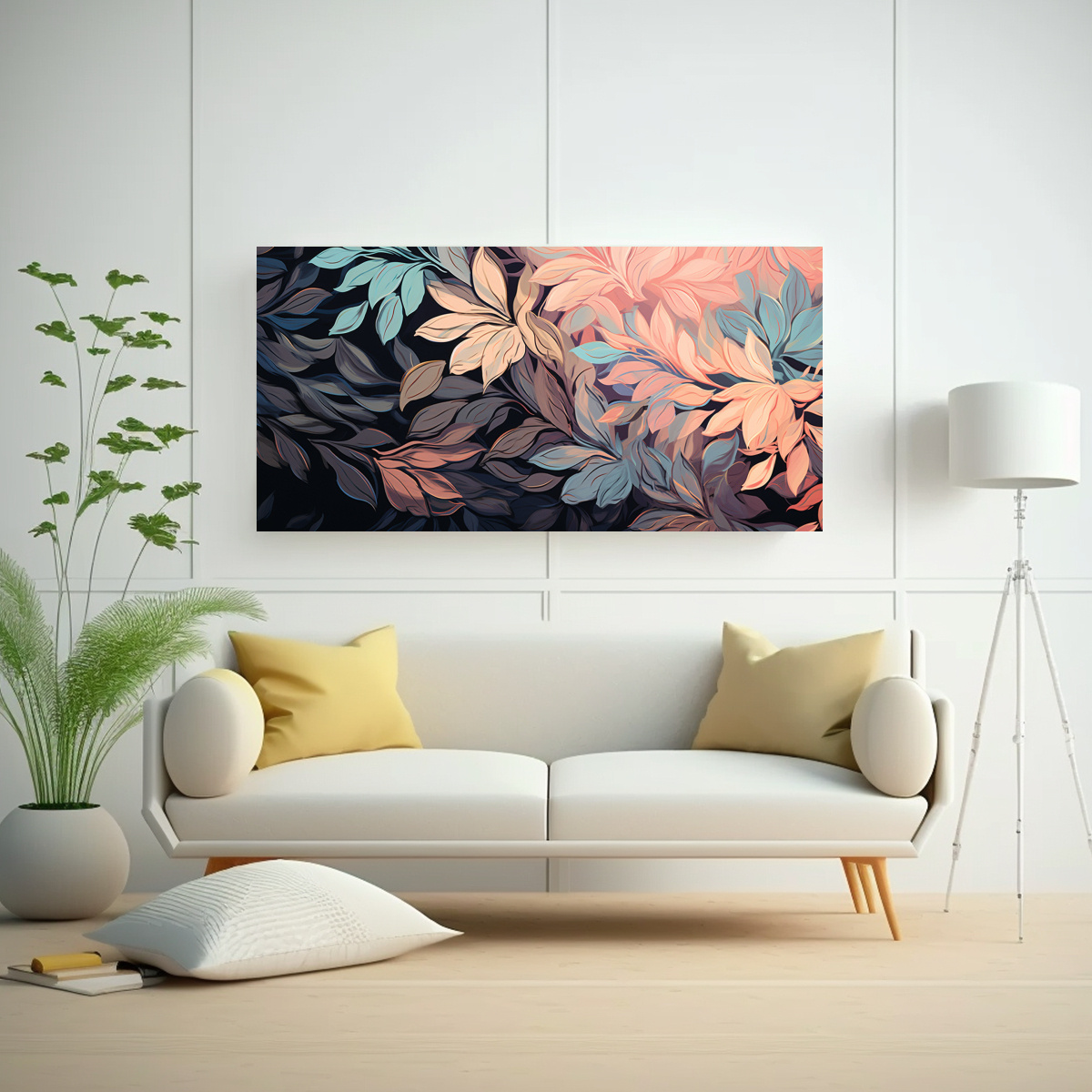 Coloca este cuadro en tu sala de estar para crear un ambiente moderno y sofisticado Combínalo con muebles en tonos neutros como gris y blanco, y añade cojines en tonos rosado claro y coral para resaltar los colores del cuadro