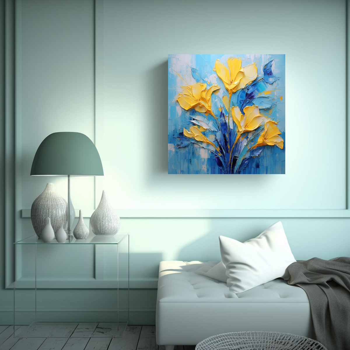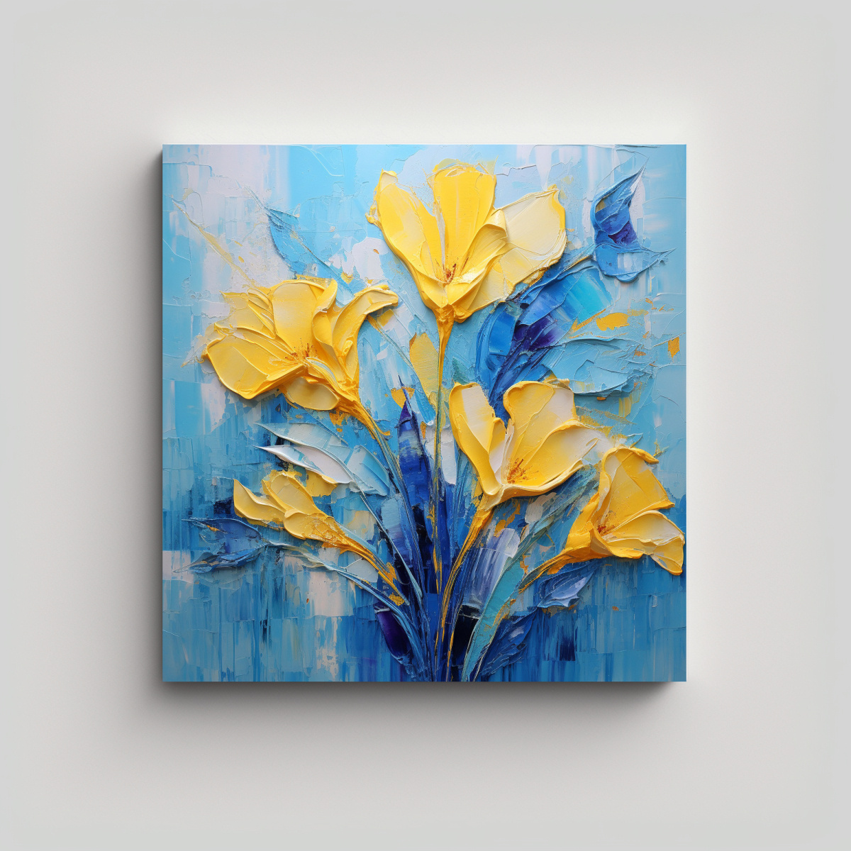 El Cuadro de Flores Amarillas y Azules es un verdadero tesoro para los amantes del arte y la decoración Su combinación de colores, como el Amarillo Claro, Turquesa, Plateado, Azul Marino grisaceo, Chocolate, Aguamarina y Verde Azulado, agregan un toque de frescura y elegancia a cualquier habitación Con detalles meticulosos y acabados impecables, este cuadro es perfecto para cualquier estilo de decoración
