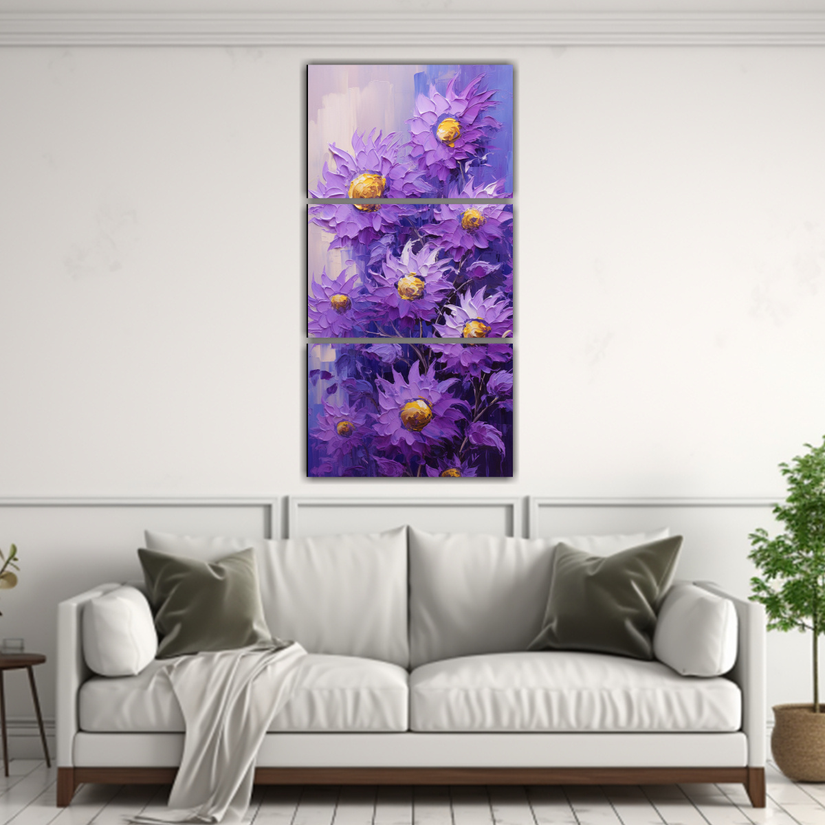 Coloca el Cuadro de girasoles morados en lienzo en tu sala de estar para crear un ambiente acogedor y elegante Combínalo con muebles en tonos neutros para resaltar los colores vibrantes del cuadro ¡Atrae todas las miradas con esta pieza única!
