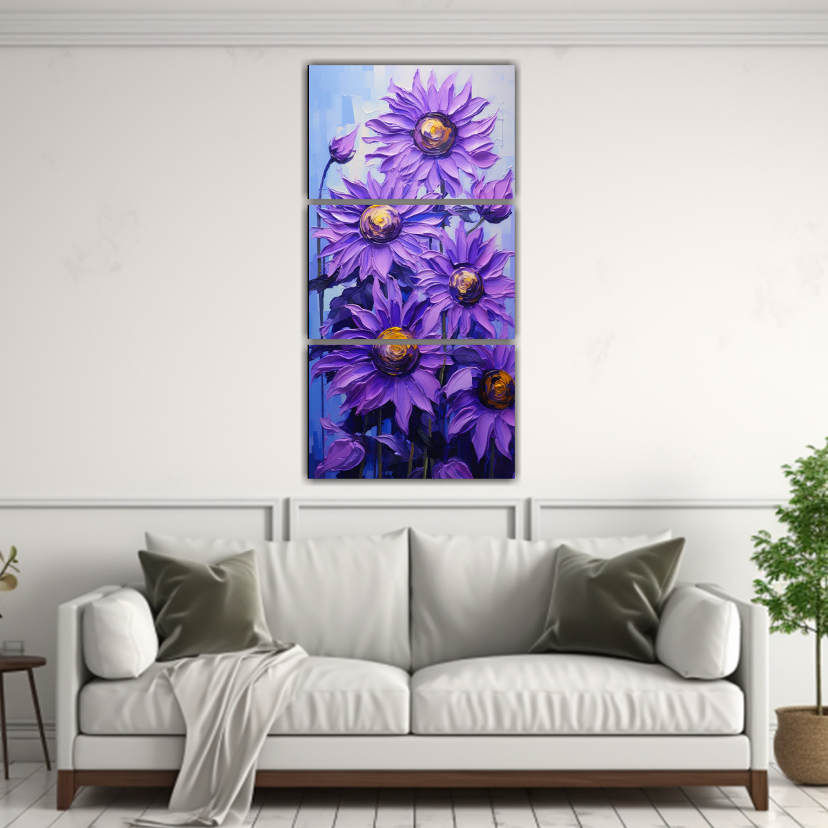 Cuadro De Girasoles Morados En Lienzo, Estilo Visión Tres Lienzos De Dibujo