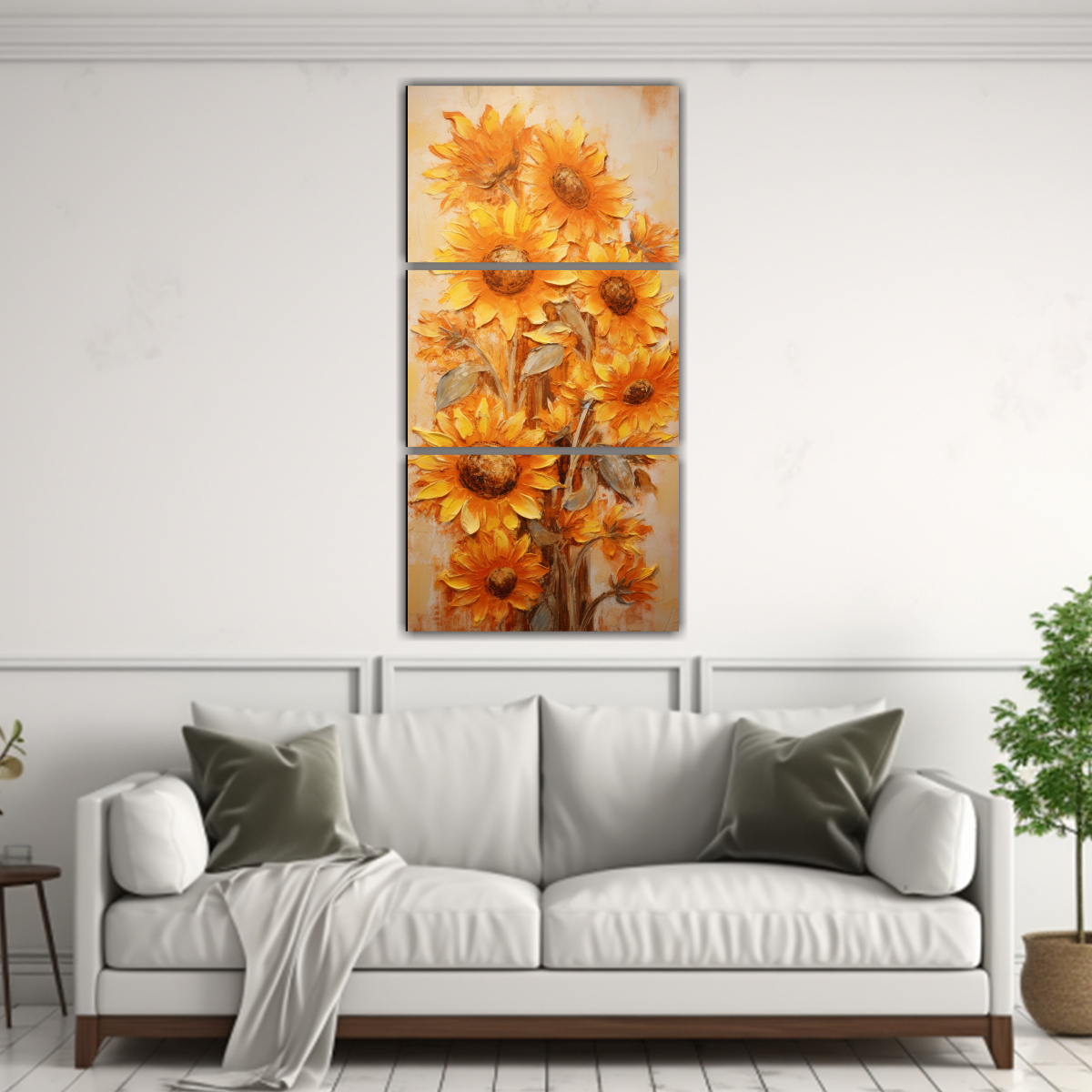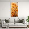 Este cuadro de girasoles naranjas en estilo rústico sería ideal para decorar tu sala de estar, creando un ambiente cálido y acogedor Combínalo con muebles de madera clara y elementos decorativos en tonos tierra para resaltar su belleza