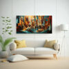 Este cuadro de ajetreo urbano en coral, turquesa y negro es perfecto para una sala de estar moderna Combínalo con muebles en tonos neutros como chocolate, gris o plateado para crear un ambiente sofisticado y urbano Colócalo sobre un sofá o una repisa para darle un toque de color y estilo a tu espacio