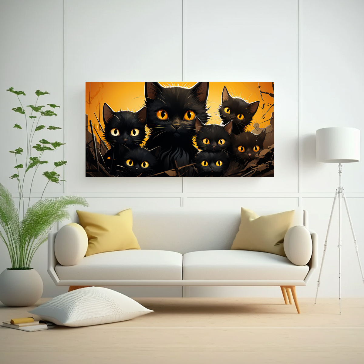 Cuadro De Lienzo Con Montón De Gatos Negros Sobre Fondo Naranja