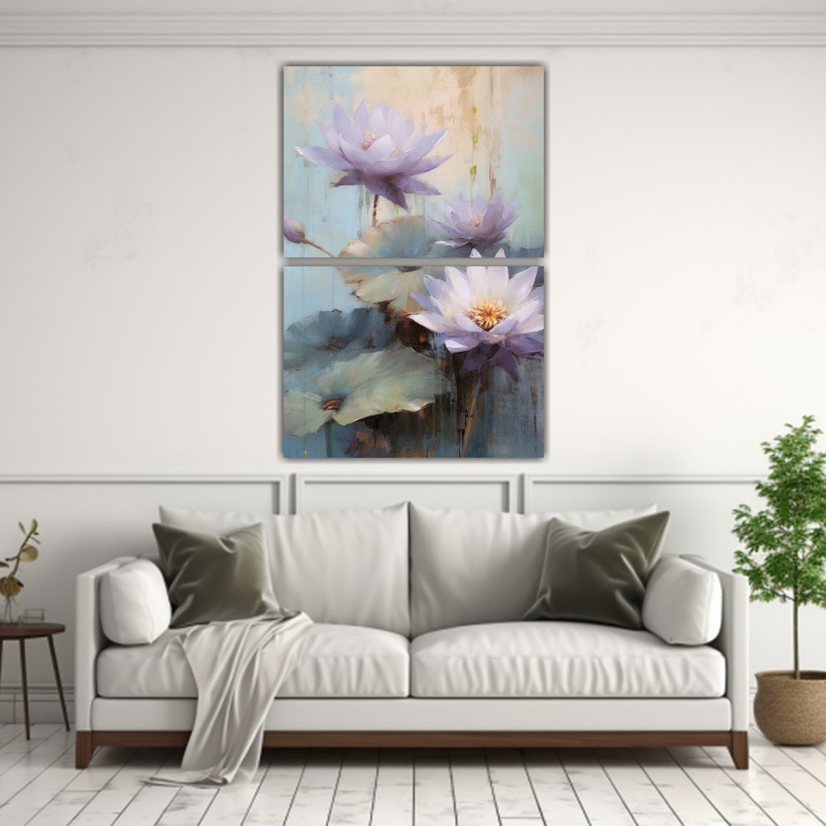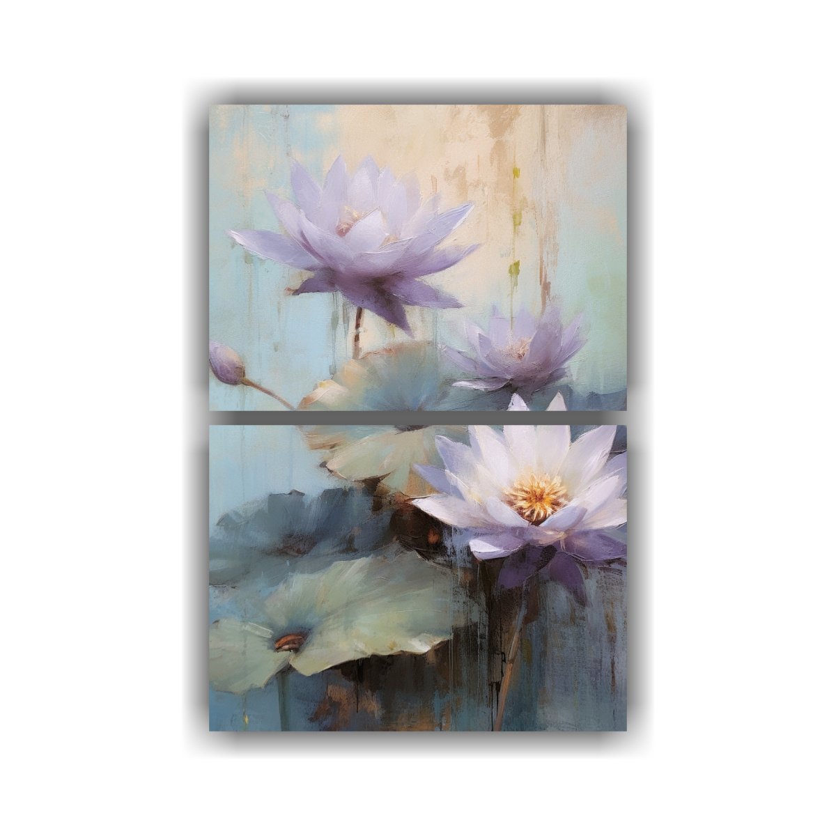 DecoCuadros te ofrece cuadros de lienzo con movimiento de representación de pintura al estilo Estilo óleo de hermosas flores de loto moradas Con colores plateado, azul marino grisaceo, gris y beige, estos cuadros impresos en tela de alta calidad con bastidores de madera son ideales para decorar tus paredes Disfruta de la mejor calidad y precios económicos en nuestra tienda online