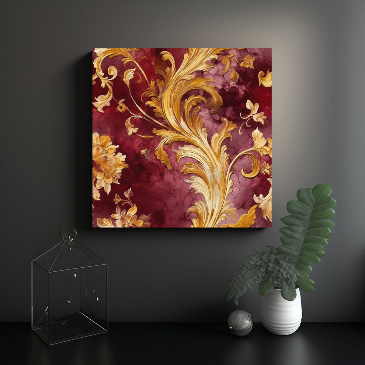 Este cuadro de lienzo moderno en tonos granate y oro es ideal para decorar tu sala de estar o dormitorio Colócalo sobre un sofá gris para resaltar sus colores cálidos y combínalo con cojines en tonos dorados y plateados para un estilo sofisticado y glamuroso