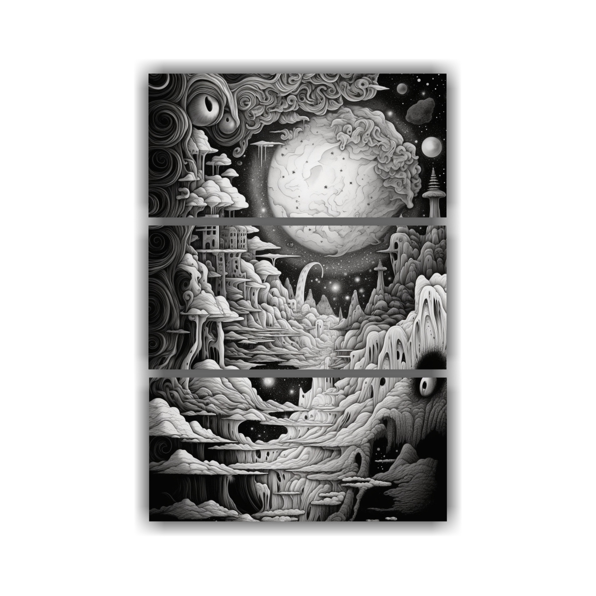Cuadro De Línea De Arte De Tres Composiciones En Tonos Brillantes De Una Geoda Despierta En Una Página Completa Negra