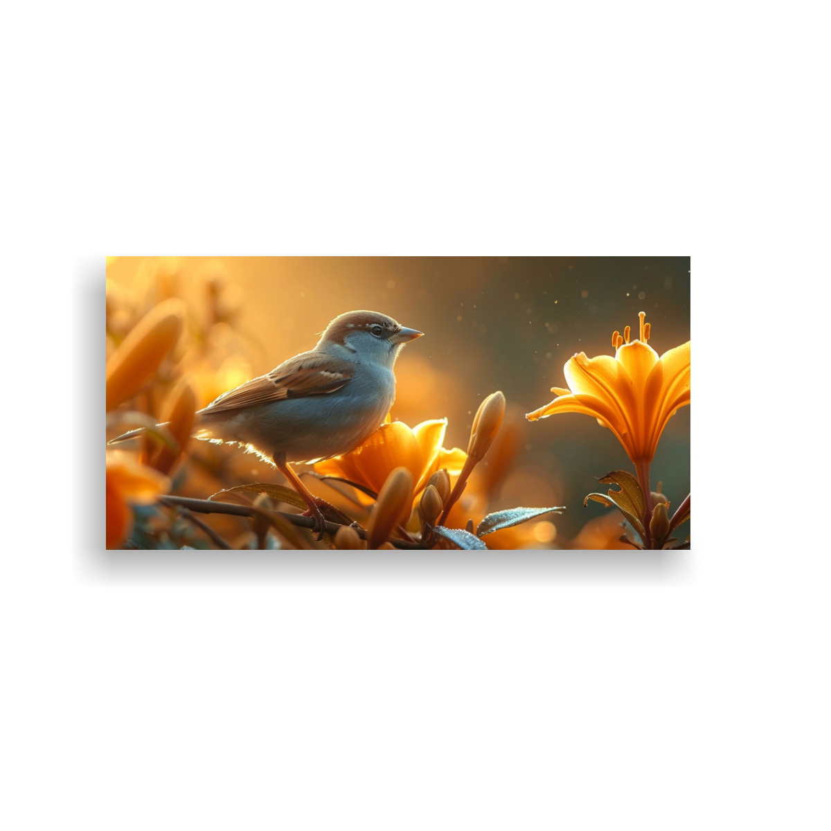 Cuadro De Lona Moderno: Gorrión Y Lirio Bajo Luz Solar
