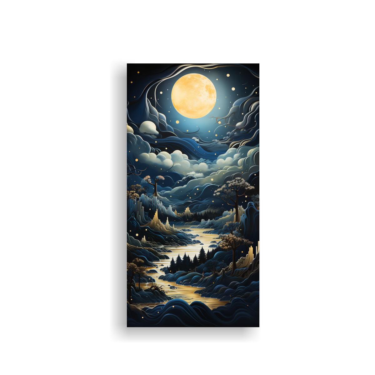 Coloca el cuadro de montaña con luna intensa en la profundidad en tu sala de estar para crear un ambiente relajante y misterioso Combínalo con muebles de colores neutros y accesorios en tonos azules y grises para resaltar su belleza