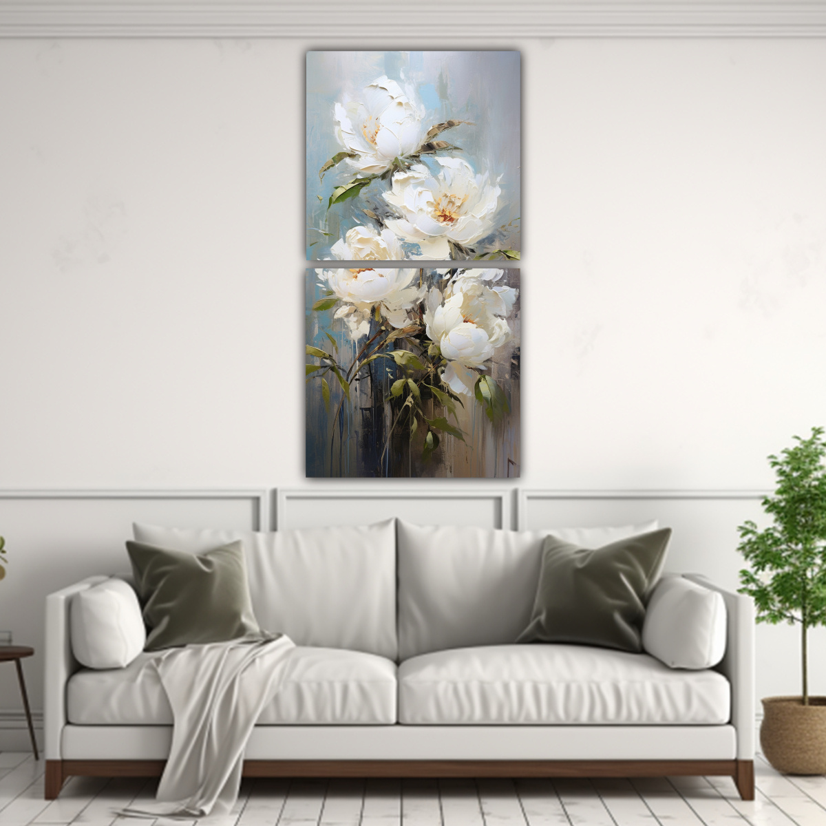 Coloca este elegante cuadro de PEONIAS blancas en estilo de pintura decorativa en la pared de tu oficina para crear un ambiente sofisticado y relajante Combínalo con muebles en tonos plateados, azul marino grisaceo y beige para lograr una decoración armoniosa y moderna