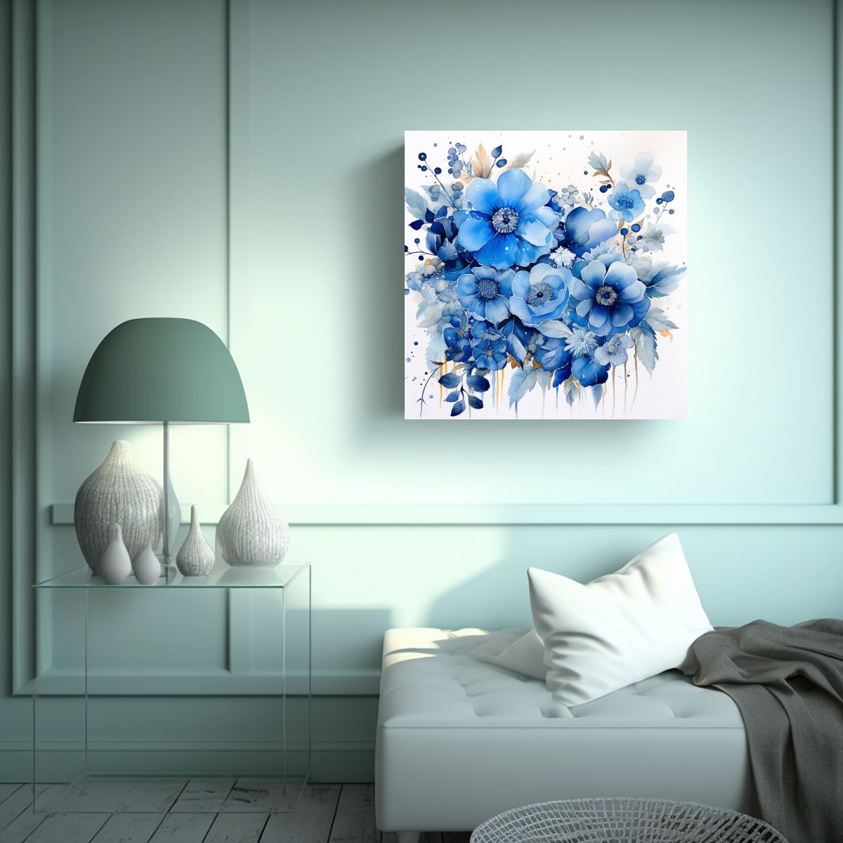 Decora tu oficina con este cuadro de pintura floral acuarela en tonos azules Nuestros cuadros impresos en tela de alta calidad con bastidores de madera son perfectos para crear un ambiente elegante y relajante El diseño exclusivo de DecoCuadros le dará un toque único a tu espacio Además, ofrecemos la mejor calidad del mercado a los precios más económicos Nuestro envío es rápido y gratuito en Santiago, y también realizamos envíos express a regiones Coloca este cuadro en tu oficina para crear un ambiente armonioso y sofisticado