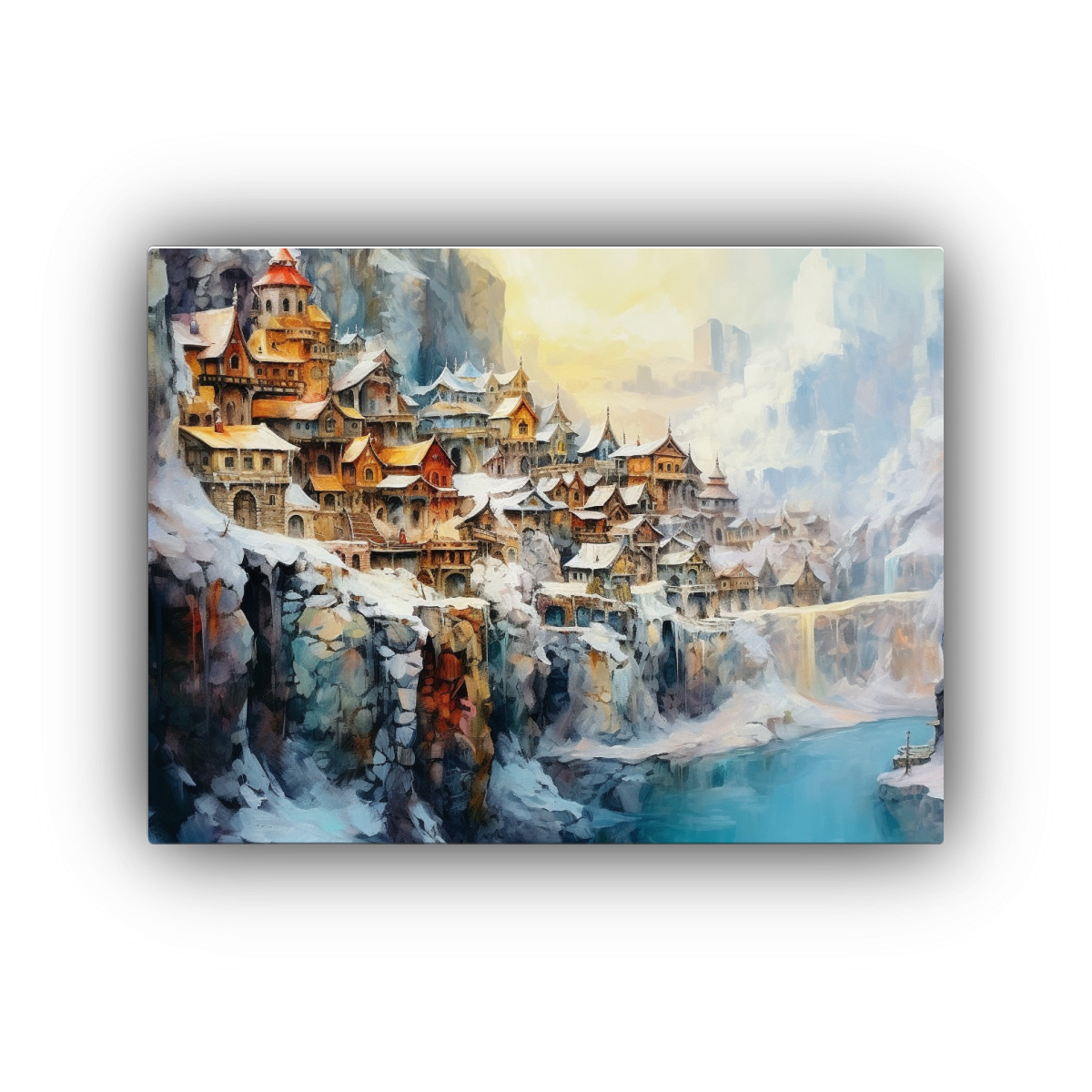Cuadro De Paisaje Invernal: Aldea De Enanos En Acantilado, Armonía Cromática.