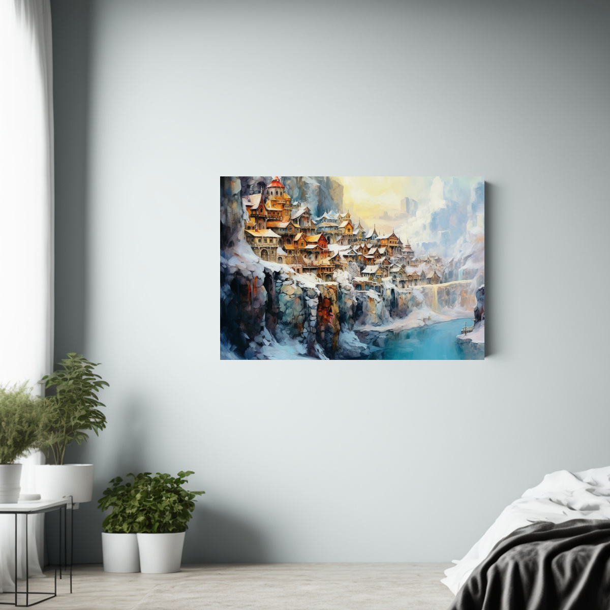 Para realzar la belleza del cuadro ‘Aldea de enanos en acantilado’, te recomendamos colocarlo en la sala de estar sobre un mueble en tonos neutros para resaltar la armonía cromática Combínalo con cojines en tonos plateados, azules y grises para crear un ambiente acogedor y sofisticado