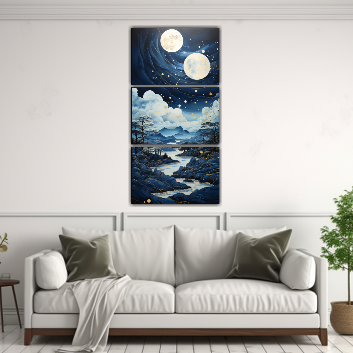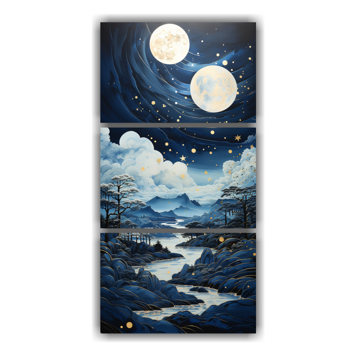 Cuadro De Paisaje Nocturno Con Luna Sobre Montañas.