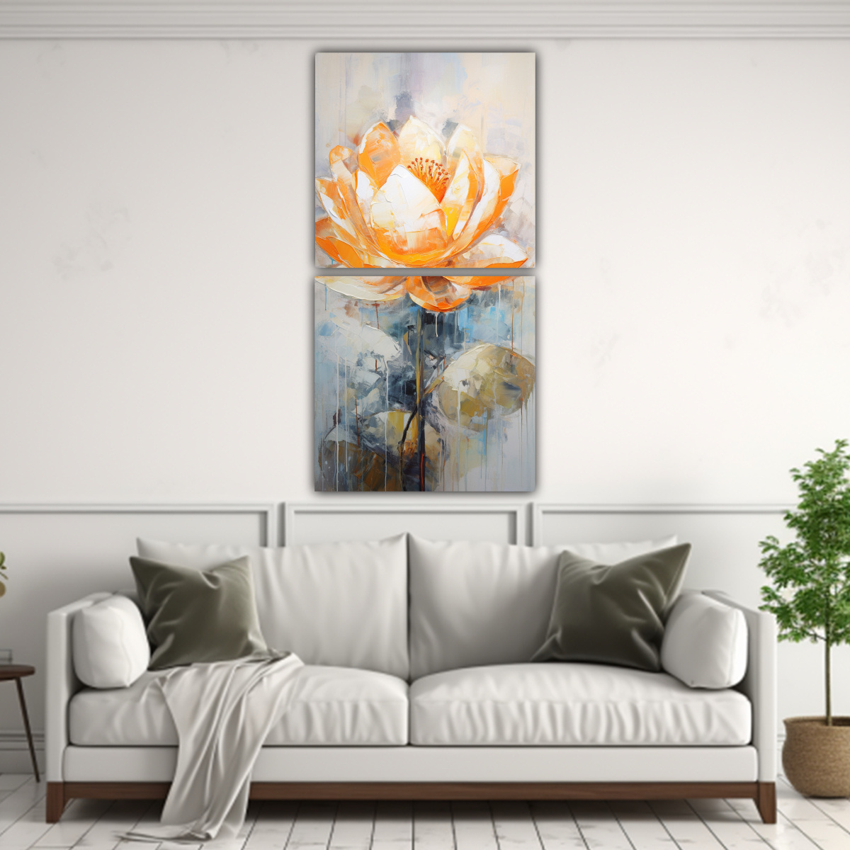 Decora tus paredes con elegancia y alegría con el cuadro de pared loto naranja en lienzo de alta calidad Disponible en plata, coral, dorado, gris y azul marino grisaceo Los cuadros de DecoCuadros son la mejor opción para embellecer tu hogar