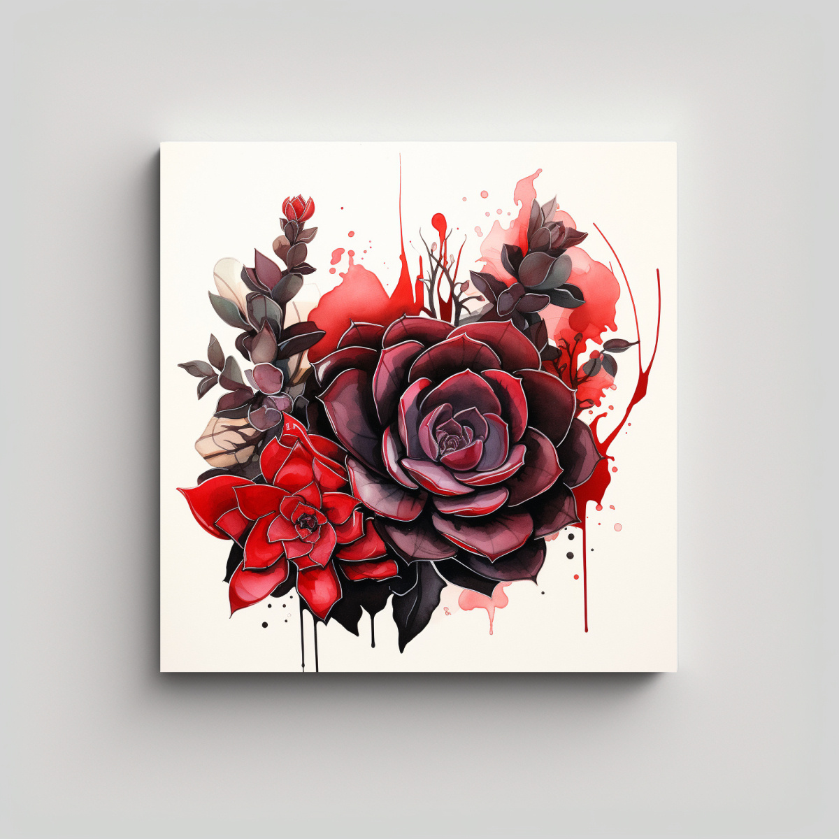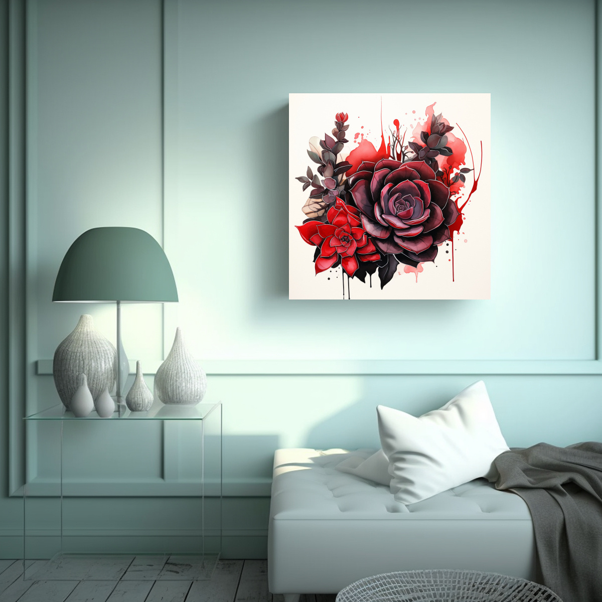 El Cuadro de Pared Composición Equilibrada Plantas Suculentas en Rojo y Negro de DecoCuadros es perfecto para agregar un toque de elegancia y color a tu hogar u oficina Con una composición equilibrada de plantas suculentas en colores carmesí, azul marino grisáceo, blanco, rosado claro, gris, coral, plateado y turquesa, este cuadro es una opción ideal para cualquier estilo de decoración