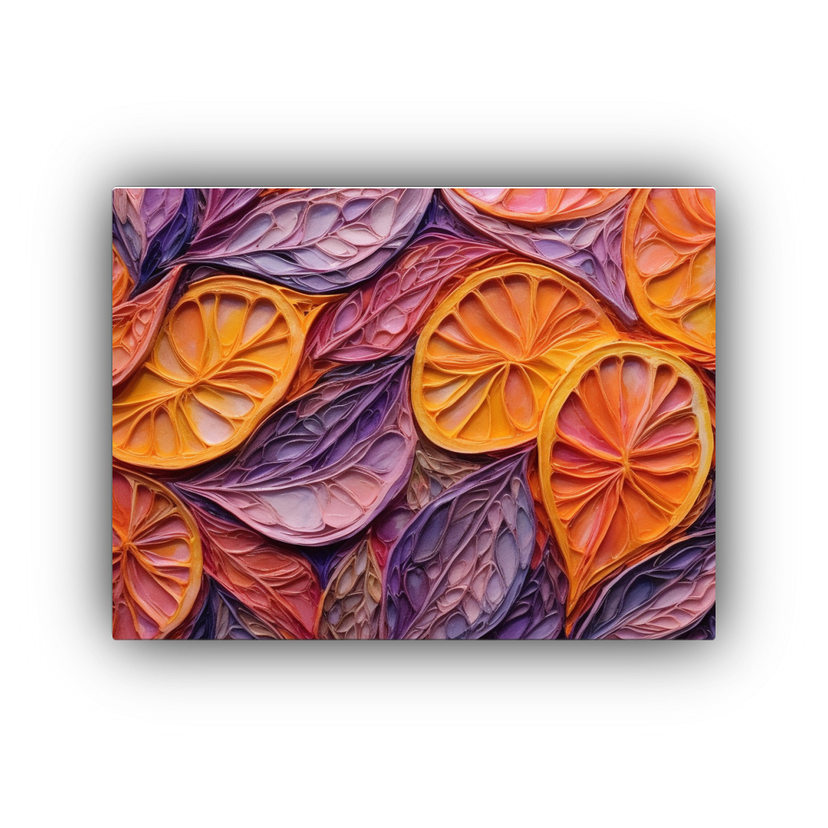 Dale un toque único a tus paredes con este cuadro fotográfico artesanal, perfecto para espacios modernos y con estilo Los patrones de naranjas y hojas en tonos vibrantes como Carmesí y Rosado Claro destacarán en tu decoración Descubre la calidad y exclusividad de DecoCuadros