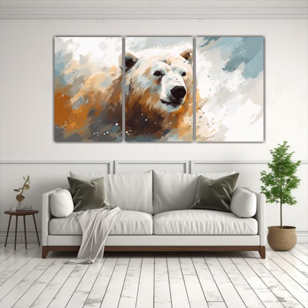 Este cuadro de un oso polar en tonos marrones y tintados sería ideal para decorar la pared principal de tu sala de estar, creando un ambiente acogedor y moderno Combínalo con muebles blancos o grises para resaltar su estilo pop art