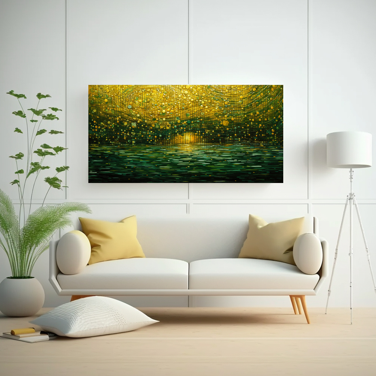 Este cuadro de tela estilo puntillismo luminoso con inspiración temática es perfecto para añadir un toque de sofisticación a tu sala de estar Colócalo sobre una pared de color neutro, como gris claro o beige, para que resalte y se convierta en el centro de atención Combínalo con muebles de estilo moderno en tonos blancos o grises para lograr un ambiente elegante y contemporáneo Completa la decoración con cojines y cortinas en tonos dorados o plateados para brindar un toque de glamour adicional Sorprende a tus invitados con esta pieza de arte única y crea un ambiente acogedor y sofisticado en tu hogar