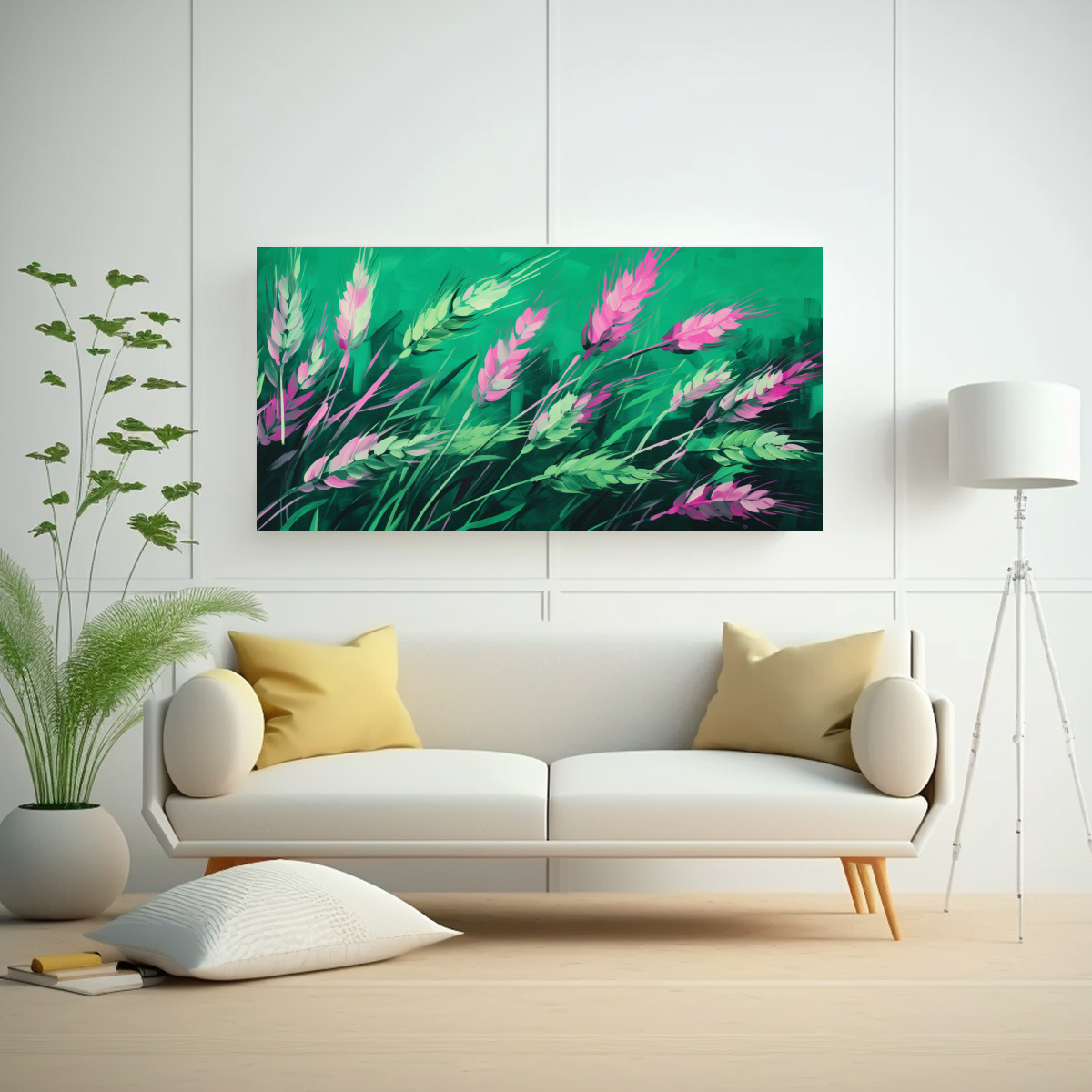 Cuadro De Tela Mágico Con Granos De Trigo En Tonos Verde Y Rosa En Atmósfera Neonoir