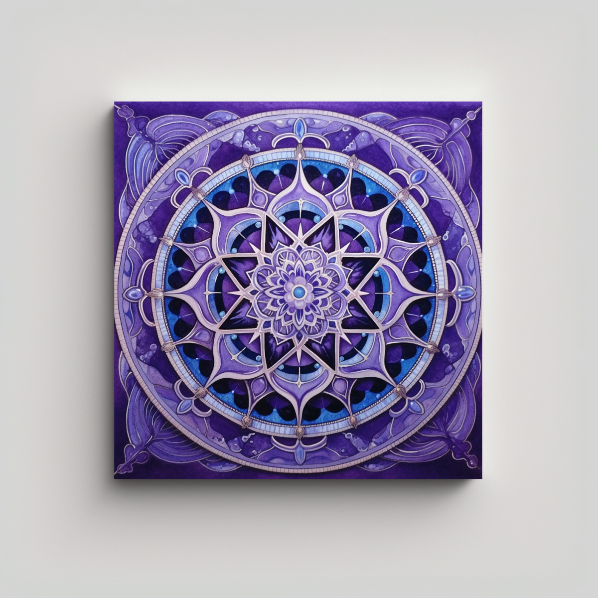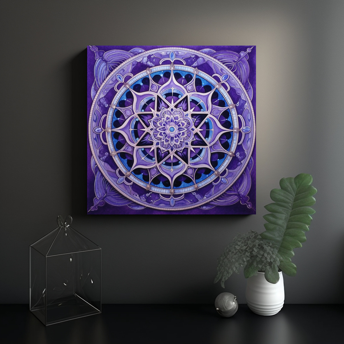 Este cuadro de tela mandala púrpura cristal elegante sería perfecto para colocar en el dormitorio sobre el cabecero de la cama, creando un ambiente relajante y sofisticado Combínalo con tonos neutros y detalles en lila para destacar su belleza