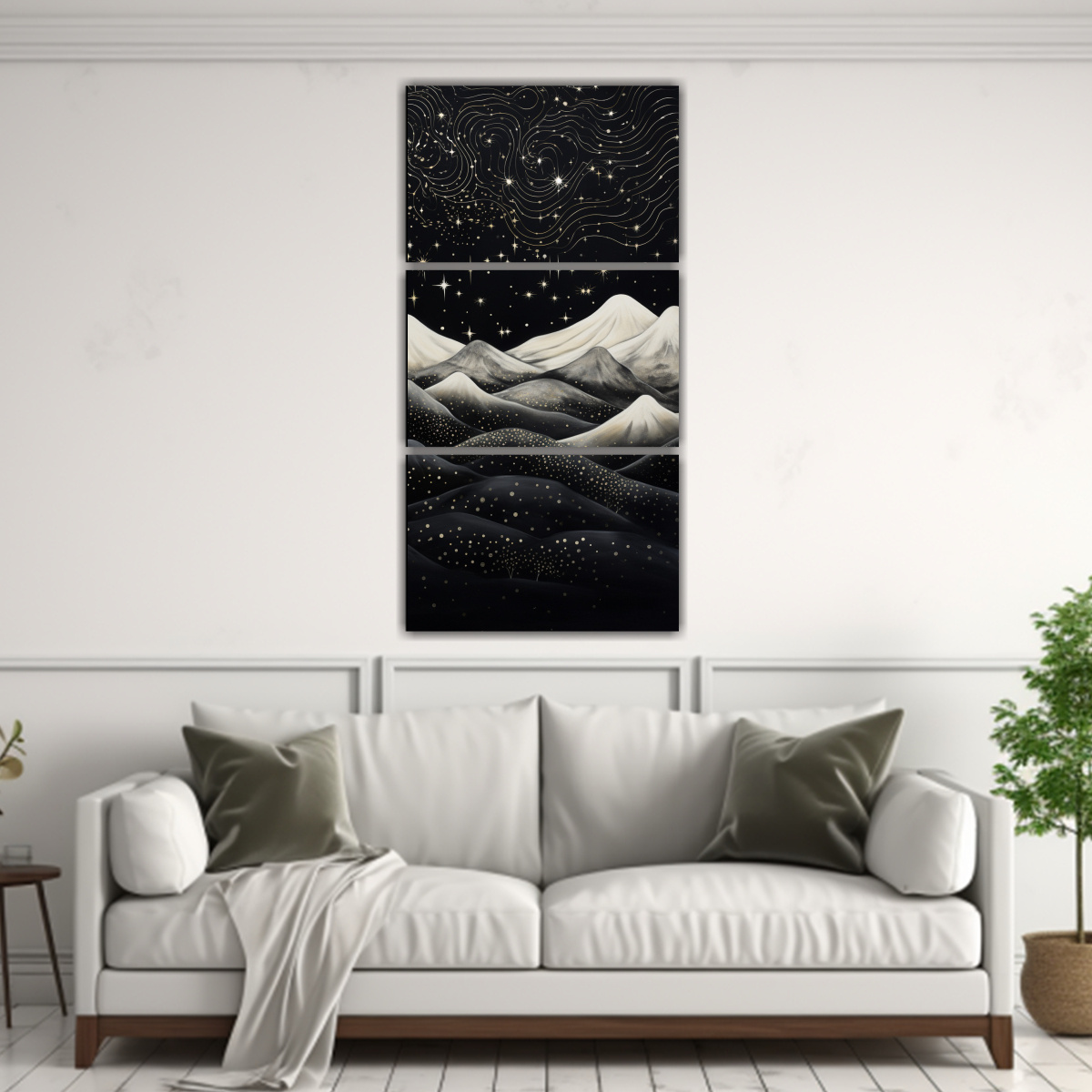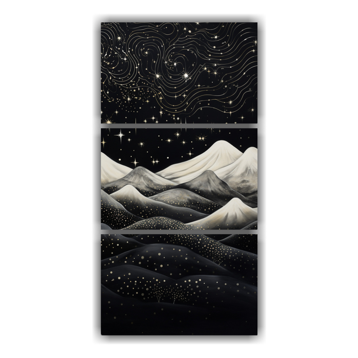 Este Cuadro de Tela Montaña con estilo elegante y 3 lienzos de composición de ambiente es perfecto para decorar tu sala de estar o dormitorio Colócalo sobre un sofá o cama para crear un ambiente relajante y sofisticado Combina los colores Plateado, Negro, Dorado, Azul Marino grisaceo y Gris con muebles de tonos neutros como blanco, beige o gris para lograr una combinación armoniosa ¡Renueva tu espacio con este hermoso cuadro!