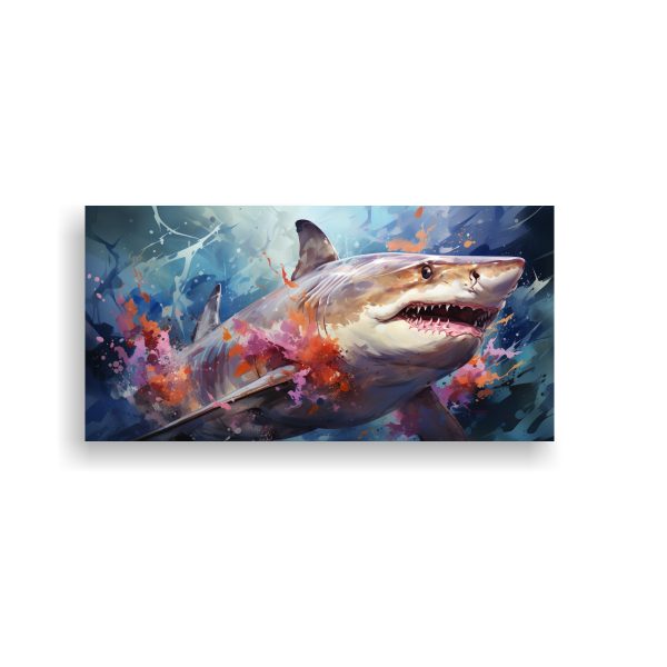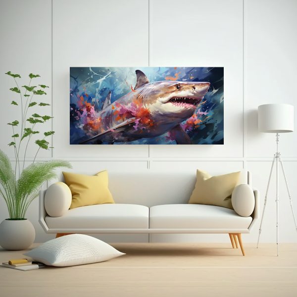Este cuadro de tela Tiburón Tigre de Arena en colores delicados y acuarela se vería perfecto en la sala de estar, sobre un sofá de tonos neutros, creando un contraste elegante y llamativo Combínalo con cojines en colores turquesa y coral para una decoración moderna y sofisticada