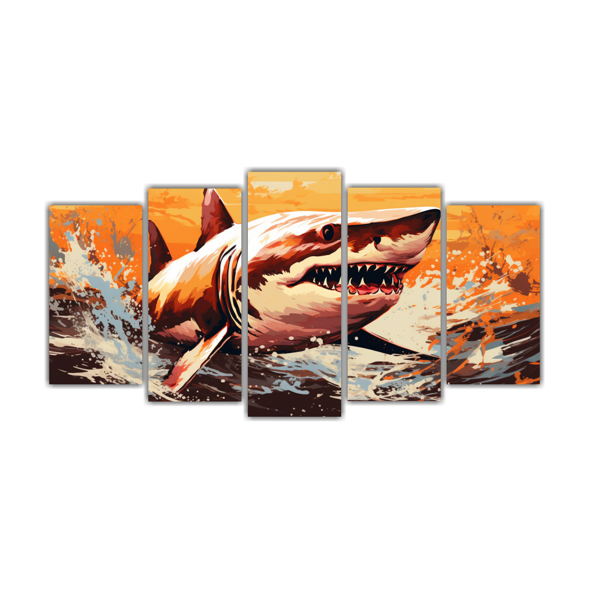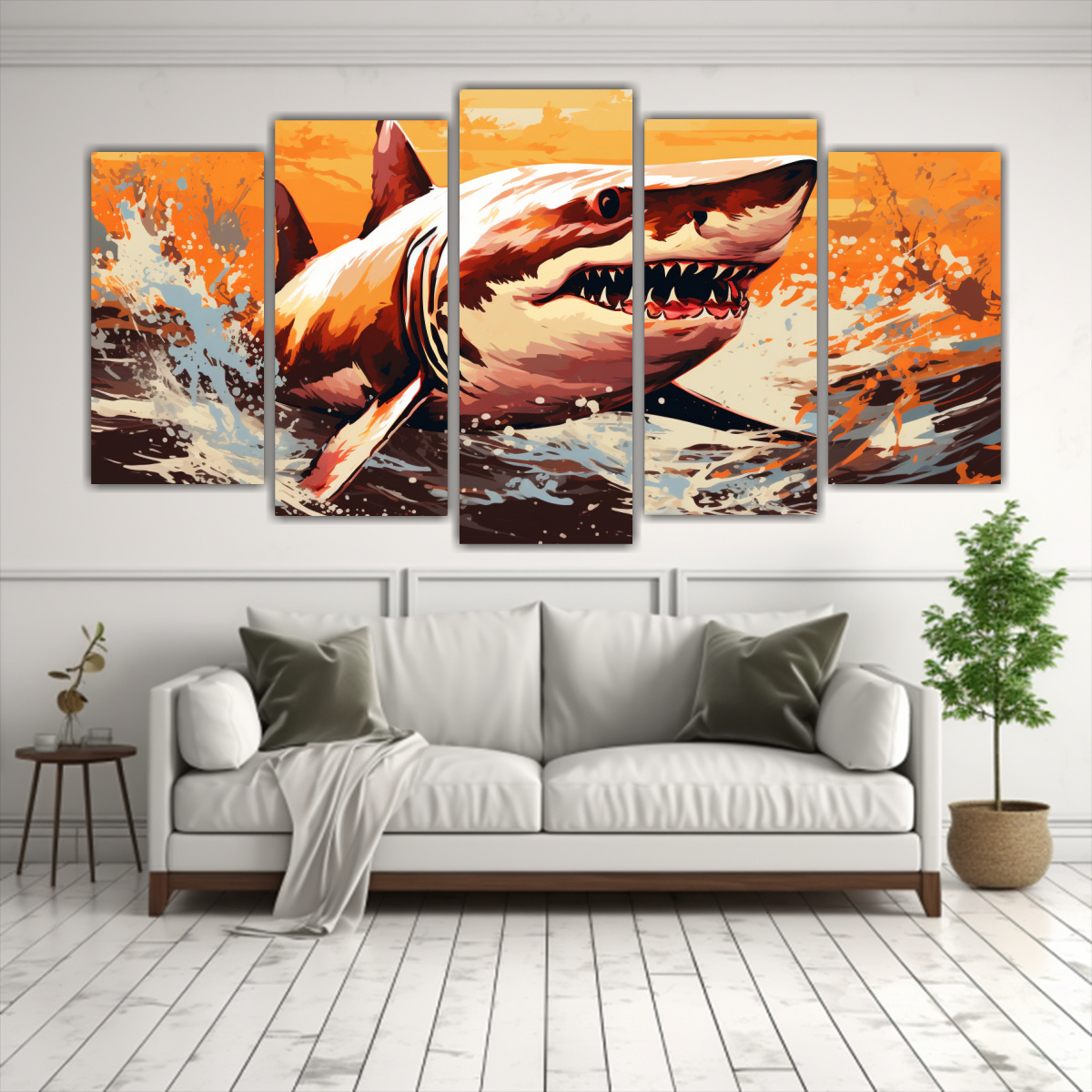 Este Cuadro de Tiburón Tigre de Arena en tonos marrón y mandarina es ideal para decorar tu sala de estar o estudio Combínalo con muebles en tonos beige, gris y amarillo claro para crear un ambiente moderno y sofisticado ¡Atrévete a darle vida a tus paredes con esta pieza única!