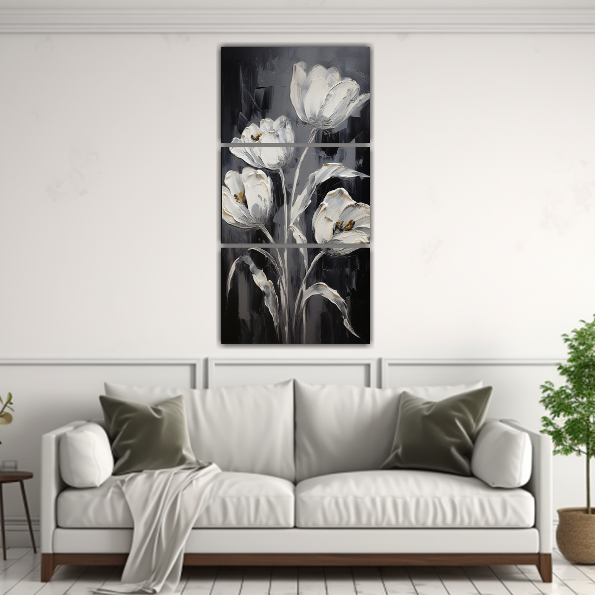 Este cuadro de tulipanes negros en estilo combinado luciría perfecto en la sala de estar, sobre un sofá de color neutro para resaltar los tonos plateados, azules y corales Combínalo con cojines en tonos mostaza para crear un ambiente acogedor y elegante