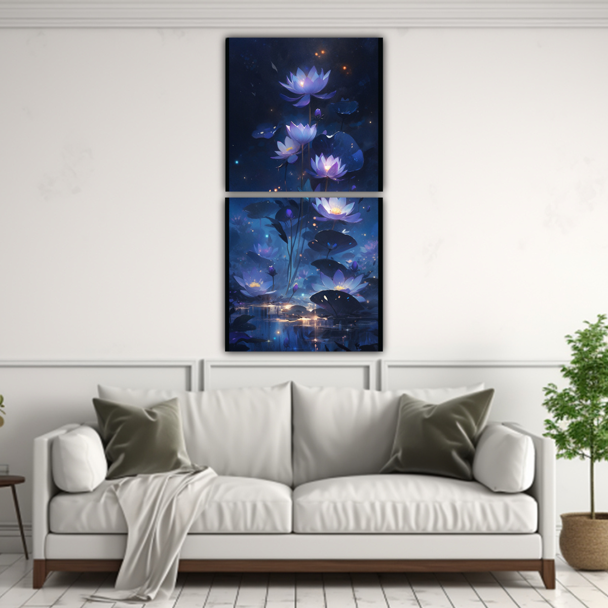 Este cuadro sería ideal para decorar tu sala de estar o tu dormitorio Puedes colocarlo sobre una pared de color claro para que resalte el contraste de colores También puedes combinarlo con cojines y cortinas en tonos plateados, grises y turquesas para crear una armonía en la decoración ¡Dale un toque elegante a tu hogar con este cuadro decorativo de loto negro brillante!