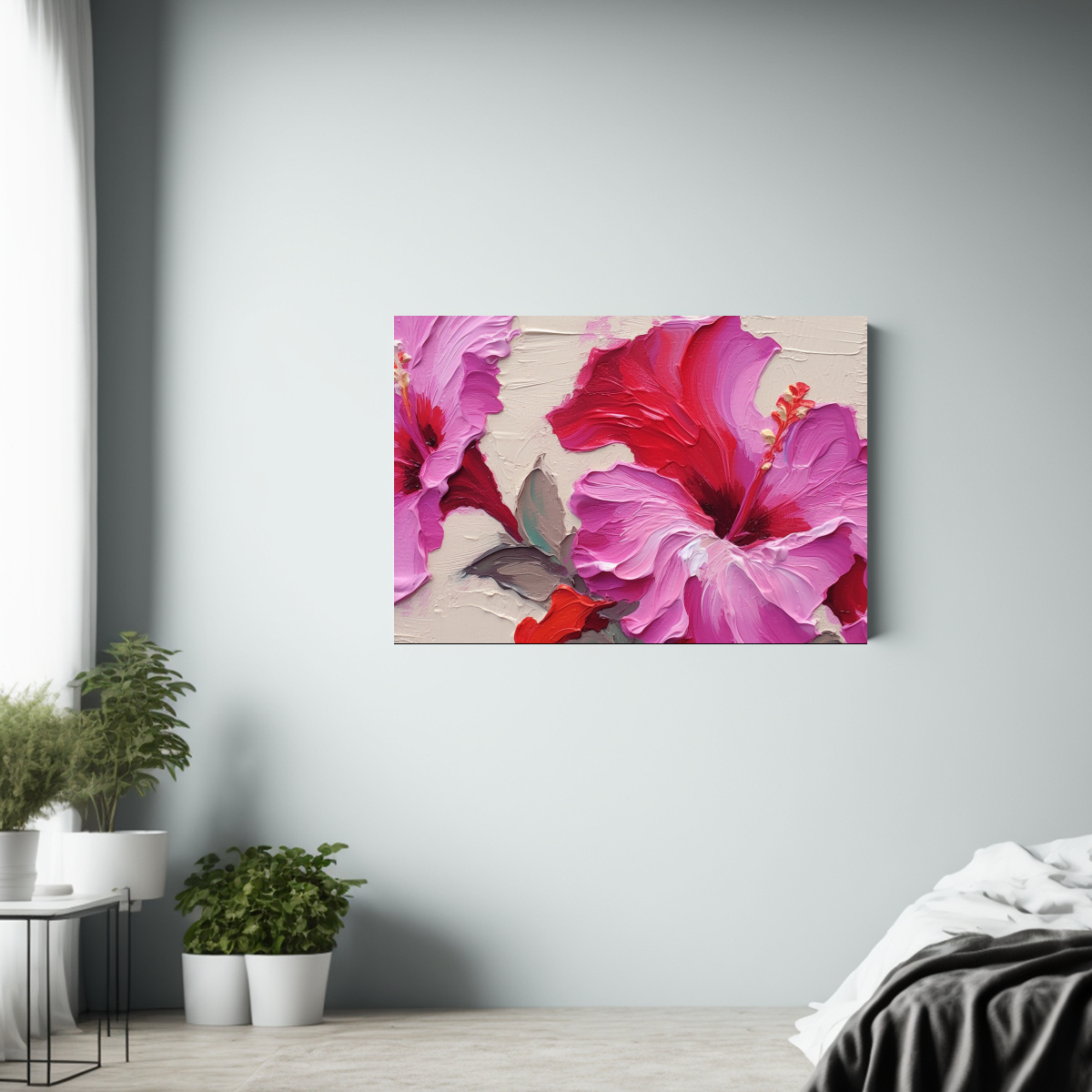 Este Cuadro Decorativo Abstracto Enigmático Hibiscus Rojo es ideal para colocar en la sala de estar, sobre un sofá de color neutro para resaltar su elegancia Combínalo con cojines en tonos plateados y lilas para crear un ambiente sofisticado y moderno