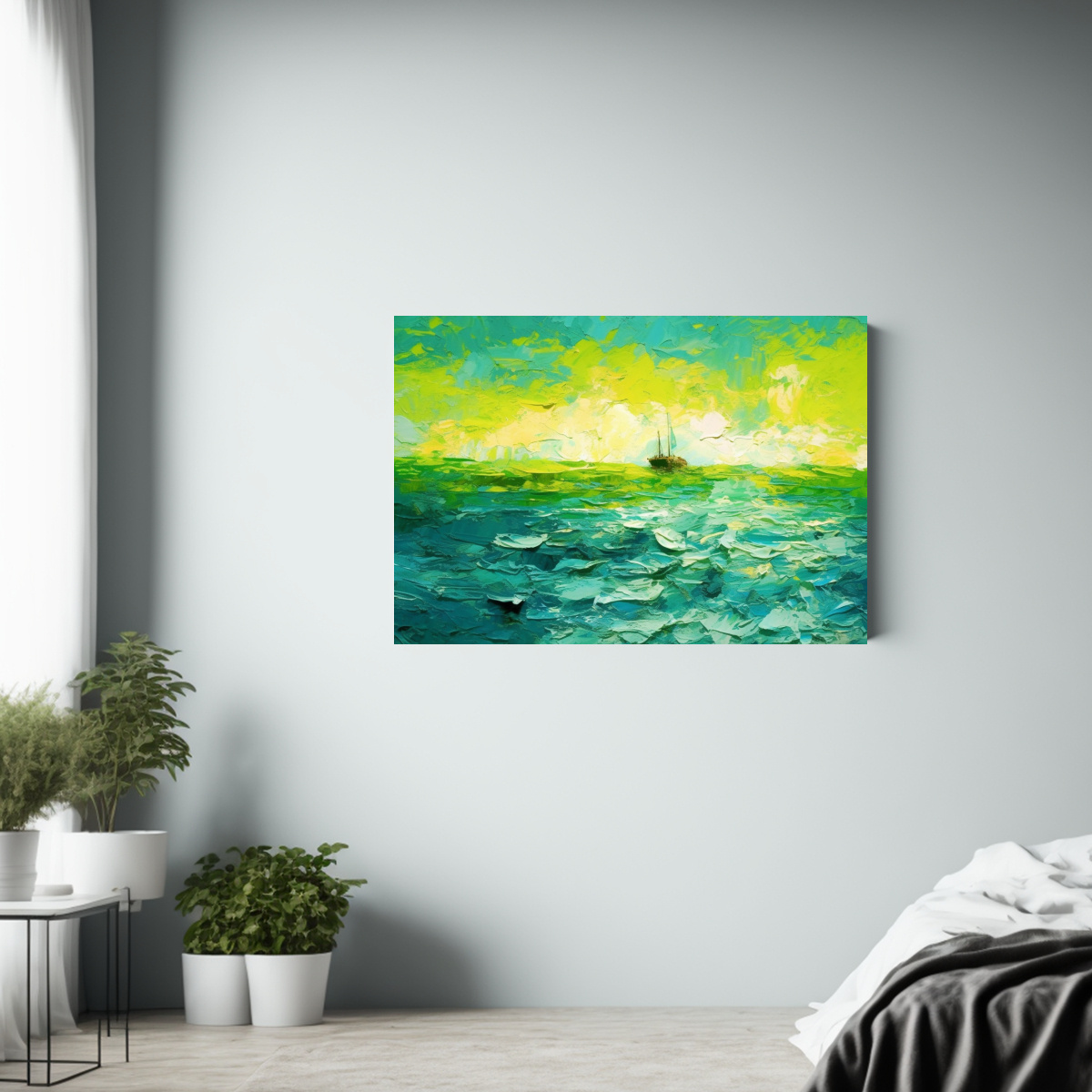 Renueva tu hogar con esta hermosa pintura digital del mar en tonos verde azulado, dorado y beige Dale un toque de frescura y tranquilidad a tu espacio con esta obra única Envíos rápidos y gratuitos en Santiago, ¡adquiere el tuyo ahora!