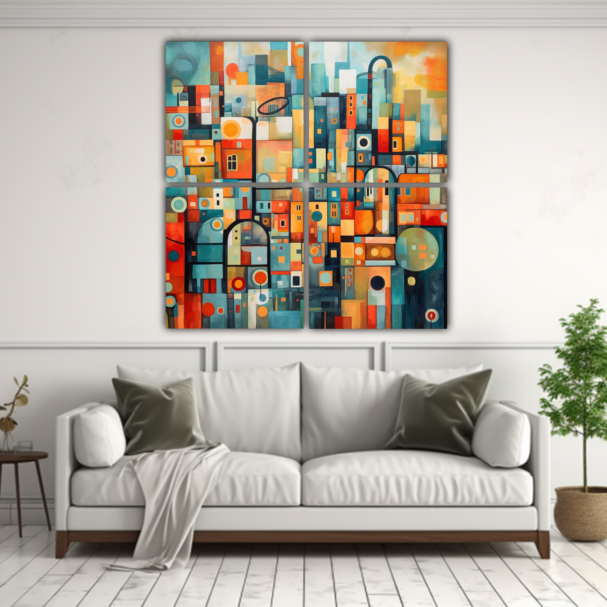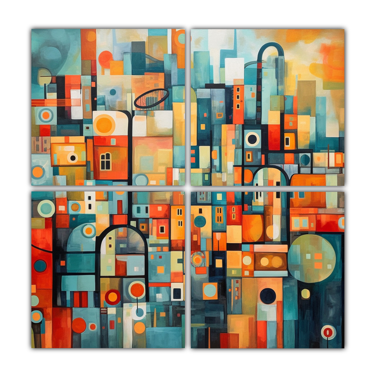 Cuadro Decorativo De Paisaje Urbano Abstracto Herdiana, Pintura Acrílica De 4 Imágenes.