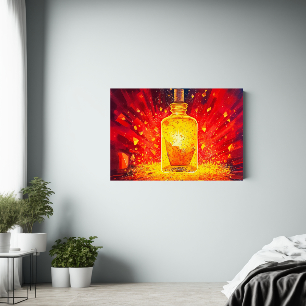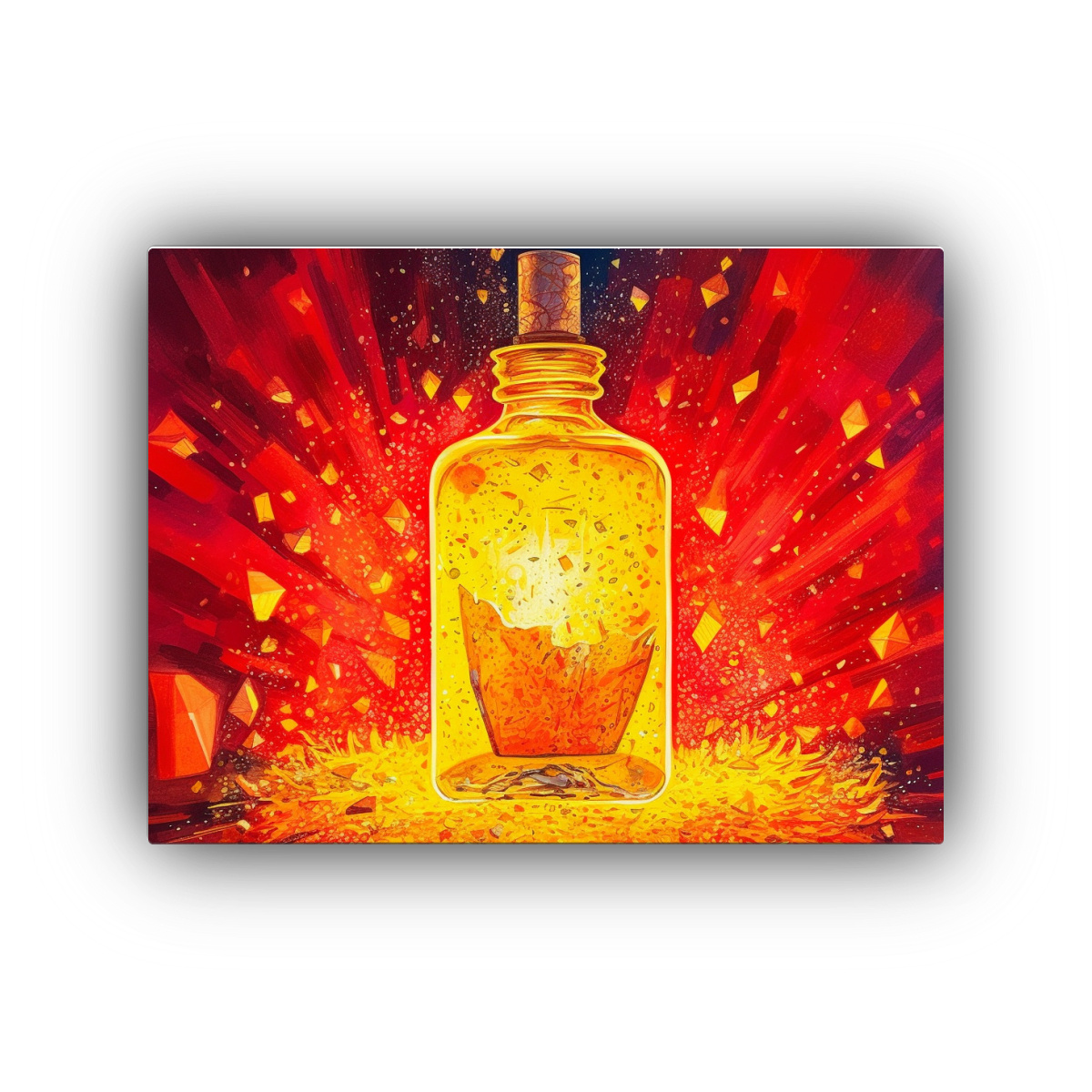 El cuadro muestra una poción amarilla en un fondo amarillo, resaltando los colores azul marino grisáceo, dorado, carmesí, rojo, coral, amarillo claro y gris Añade un toque de misterio y elegancia a tu espacio con esta obra única