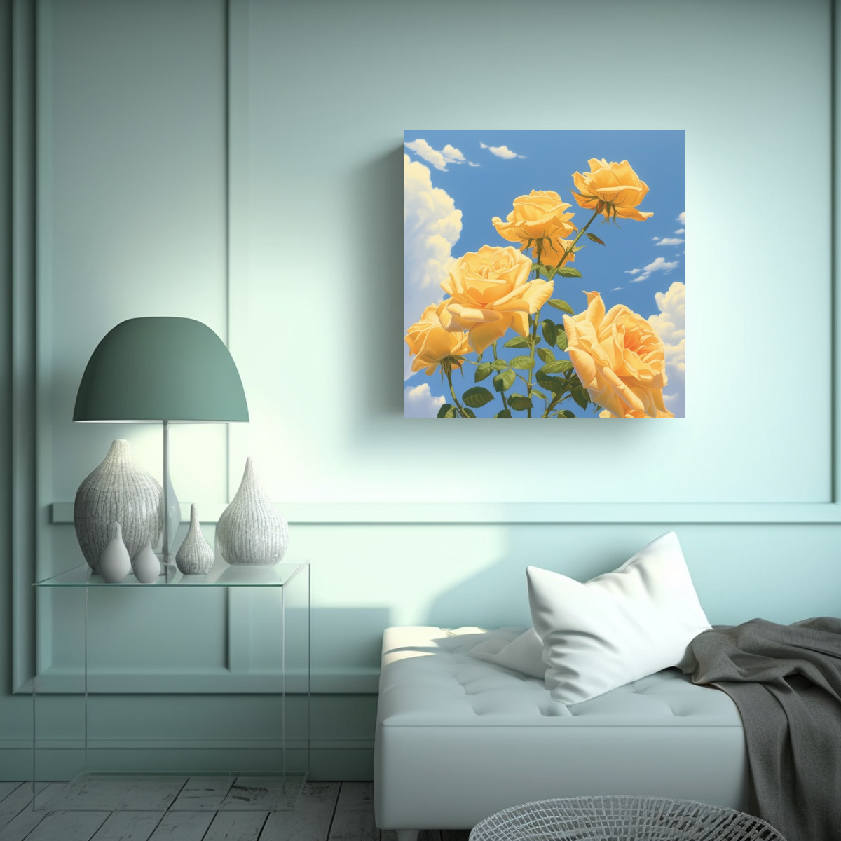 El Cuadro Decorativo de Rosas Amarillas y Cielo Azul Lienzo es perfecto para darle vida a tu espacio Sus colores vibrantes y su composición moderna lo convierten en un elemento destacado en cualquier ambiente Puedes colocarlo en tu sala de estar, dormitorio o incluso en tu oficina Aprovecha esta oportunidad y adquiere una obra de arte única y de alta calidad