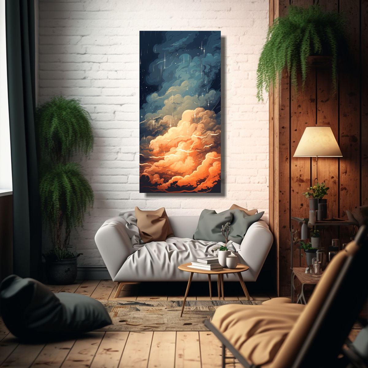 Este cuadro de tormenta con nubes en tonos rojos y marrones puede ser colocado en el salón principal de tu hogar, creando un ambiente cálido y acogedor Combínalo con muebles en tonos neutros como beige o gris, y agrega algunos cojines en color coral para resaltar los colores del cuadro También puedes colocarlo en la sala de reuniones de tu oficina, transmitiendo seriedad y elegancia ¡Deja que este cuadro sea el centro de atención de tus espacios!