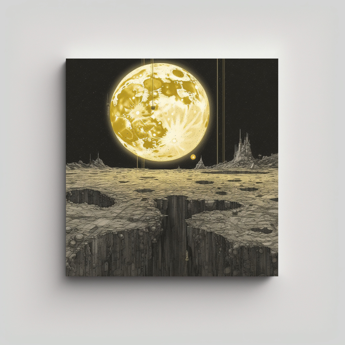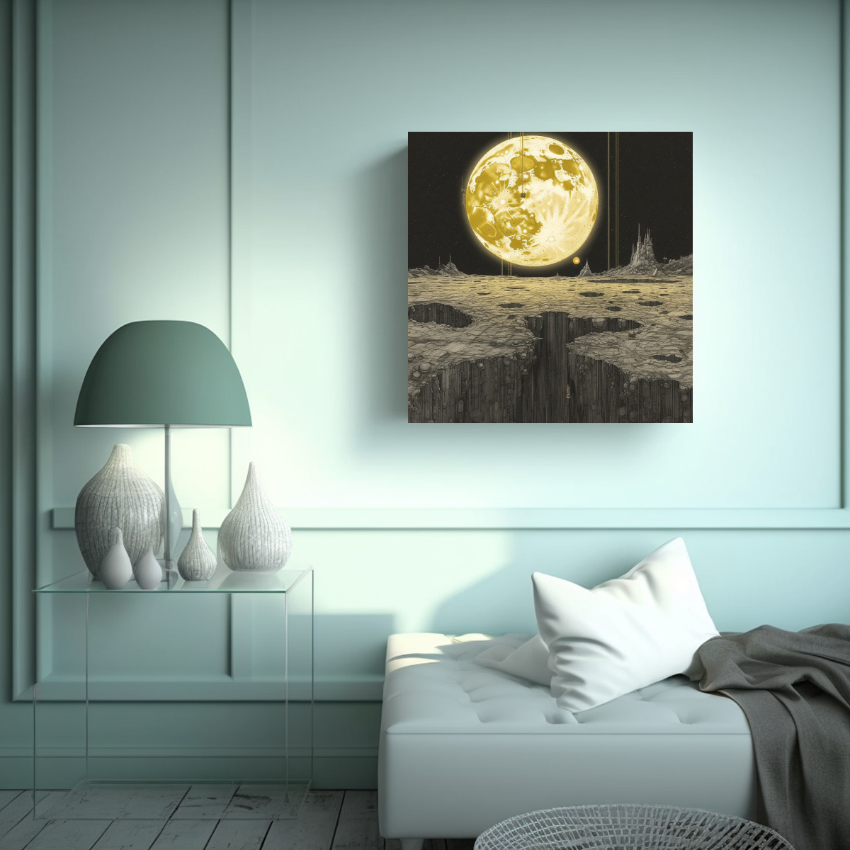 Nuestro cuadro decorativo estilo abstracción visual de la luna por Timothy Beeching en Canva es perfecto para agregar un toque de sofisticación y serenidad a tus espacios Con tonalidades azules marino grisaceo, plateado, gris y dorado, este cuadro es ideal para crear un ambiente relajante y vanguardista Impreso en tela de alta calidad con bastidores de madera, garantizamos durabilidad y acabados impecables DecoCuadros ofrece los diseños exclusivos más originales y entrega rápida y gratuita en Santiago Envíos a regiones express disponibles ¡Aprovecha nuestros precios más económicos del mercado!