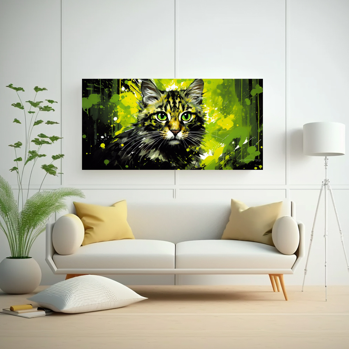 Este cuadro pop art de un felino salvaje en tonos verdes se vería espectacular en la pared principal de tu sala de estar, creando un punto focal impactante Combínalo con muebles en tonos neutros como beige o gris para resaltar su vibrante colorido ¡Atrévete a darle vida a tu espacio con esta pieza única!