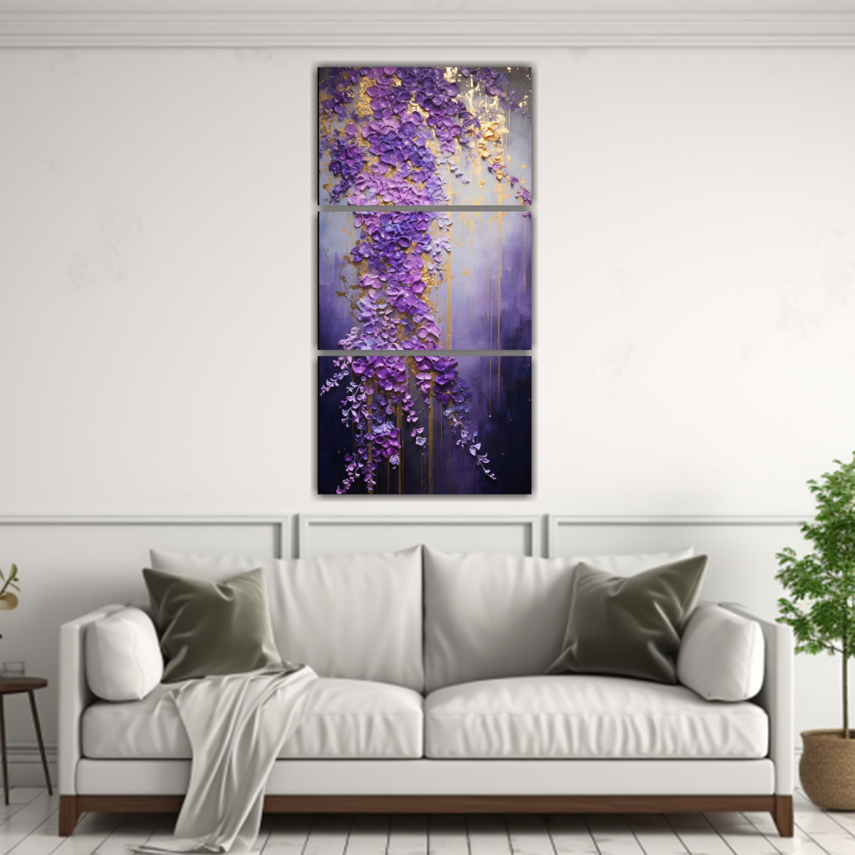 Coloca este cuadro decorativo estilo tríptico en tonos morados y dorados en tu sala de estar o dormitorio para agregar un toque de elegancia y calidez Combina este cuadro con muebles en tonos neutros como el blanco o el gris claro, y agrega cojines y cortinas en tonos dorados para resaltar los colores de la obra Este cuadro también lucirá espectacular en una oficina o sala de reuniones, añadiendo un toque de sofisticación y estilo a tu espacio de trabajo